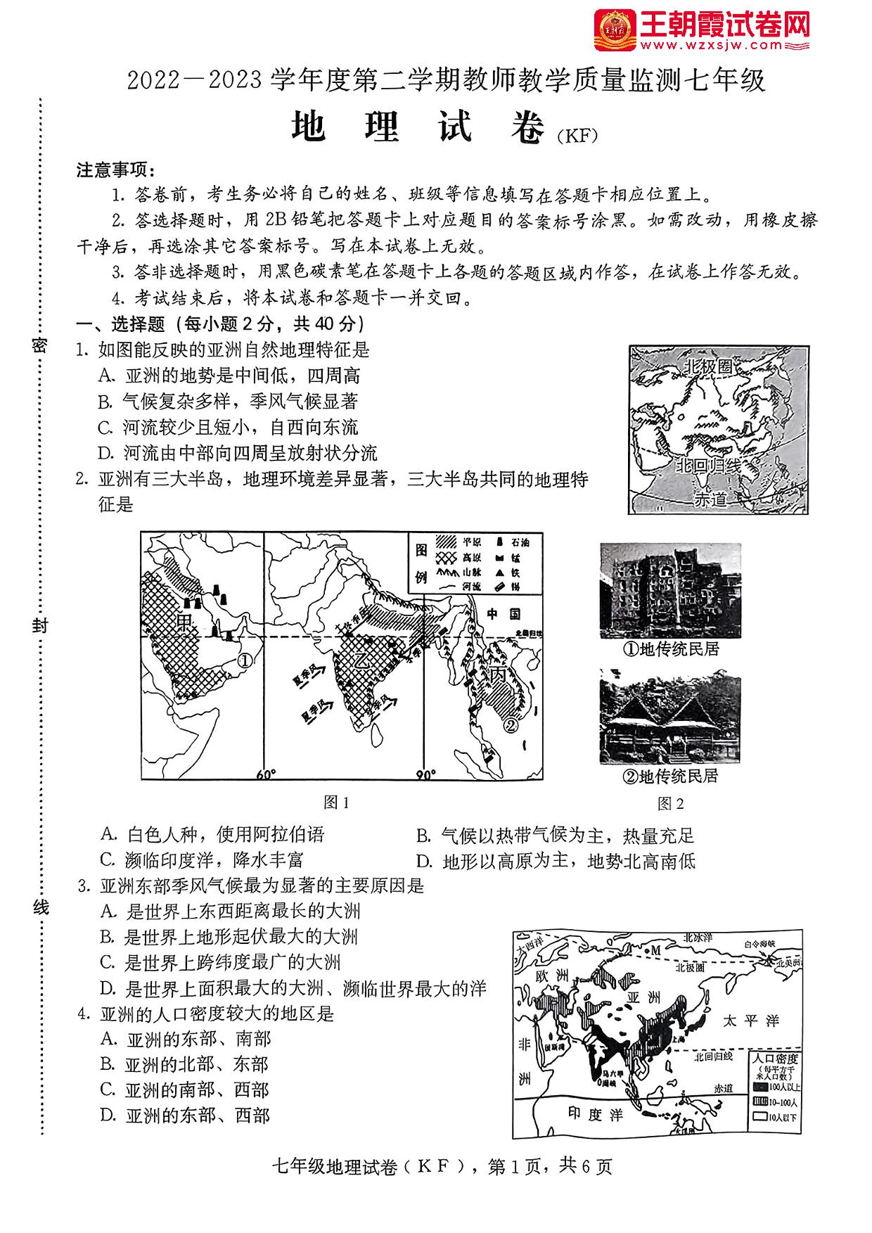 河北省保定市清苑区2022-2023学年度第二学期教师教学质量监测期中试卷七年级地理(湘教版)