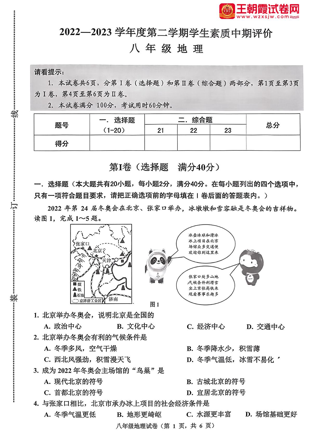 河北省唐山市古冶区2022-2023学年度第二学期学生素质中期评价试卷八年级地理(人教版)