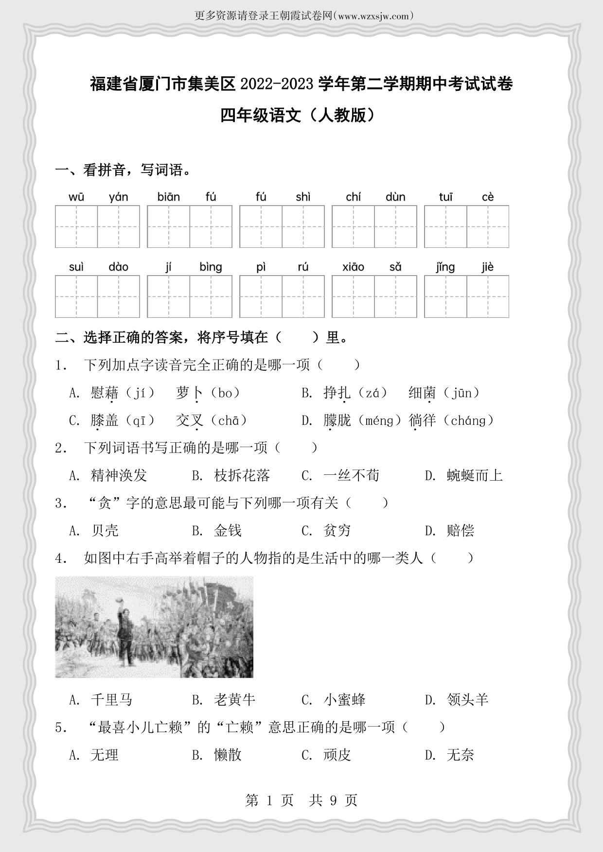 福建省厦门市集美区2022-2023学年第二学期期中考试试卷四年级语文(人教版)