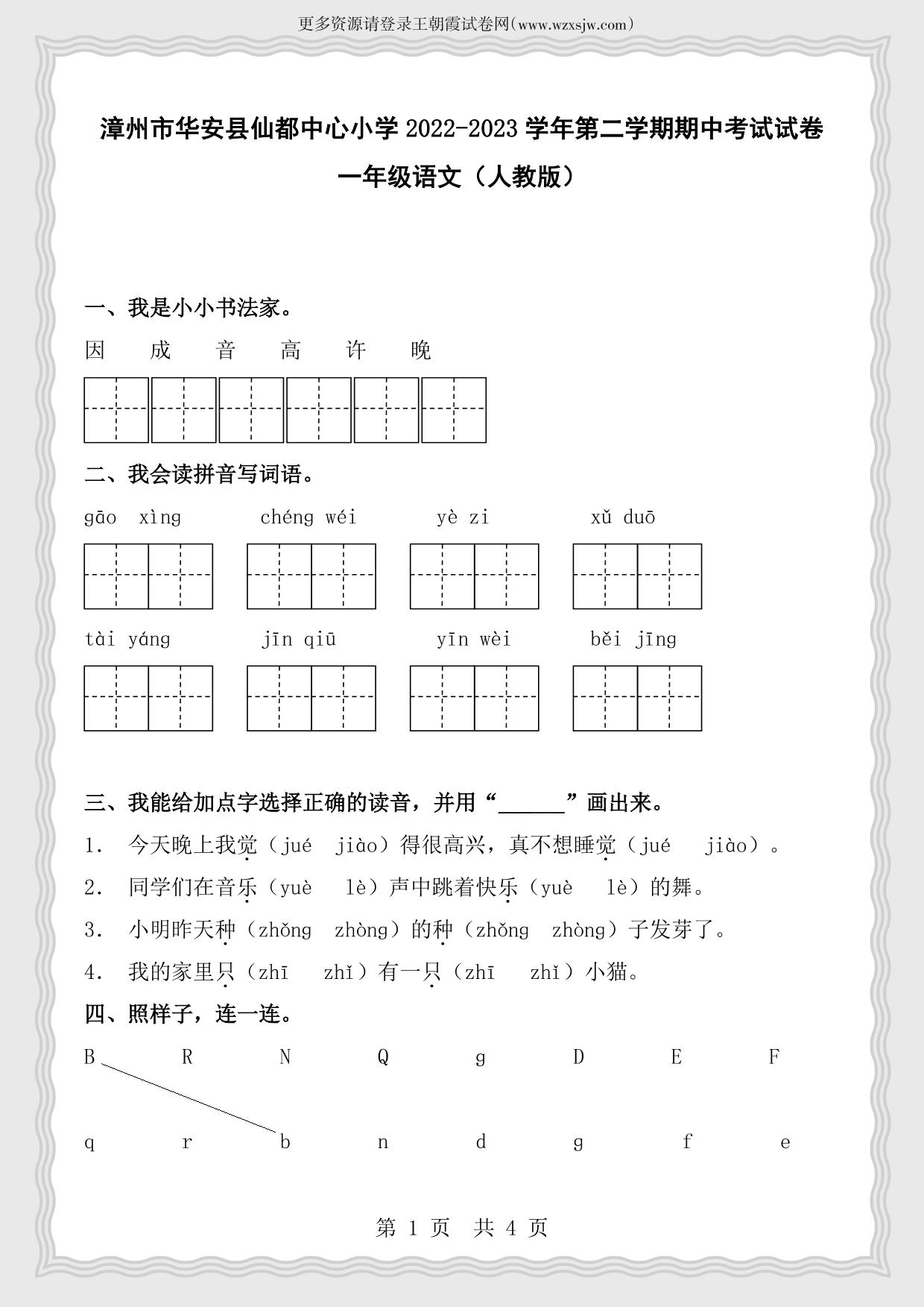 福建省漳州市华安县仙都中心小学2022-2023学年第二学期期中考试试卷一年级语文(人教版)