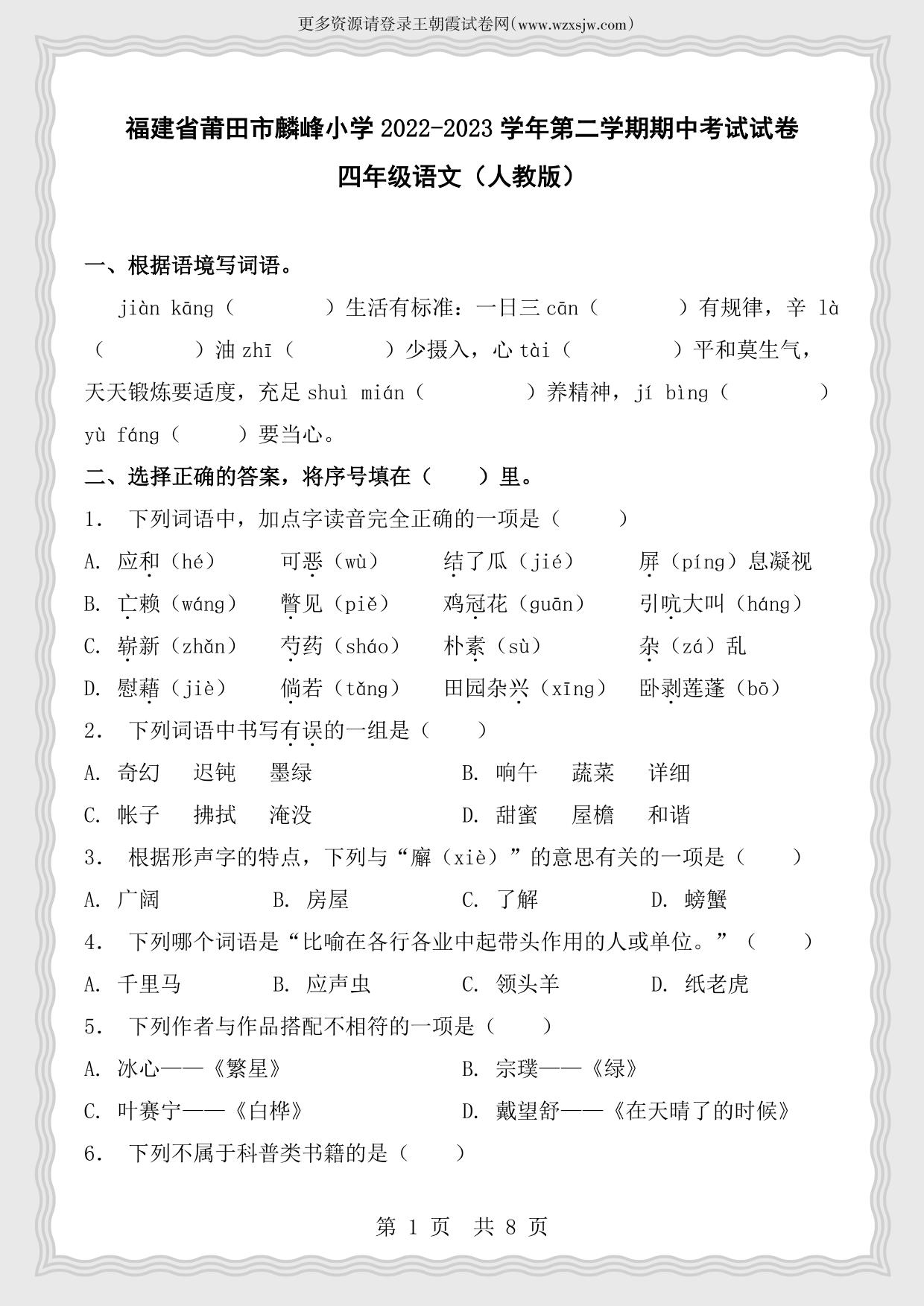 福建省莆田市麟峰小学2022-2023学年第二学期期中考试试卷四年级语文(人教版)