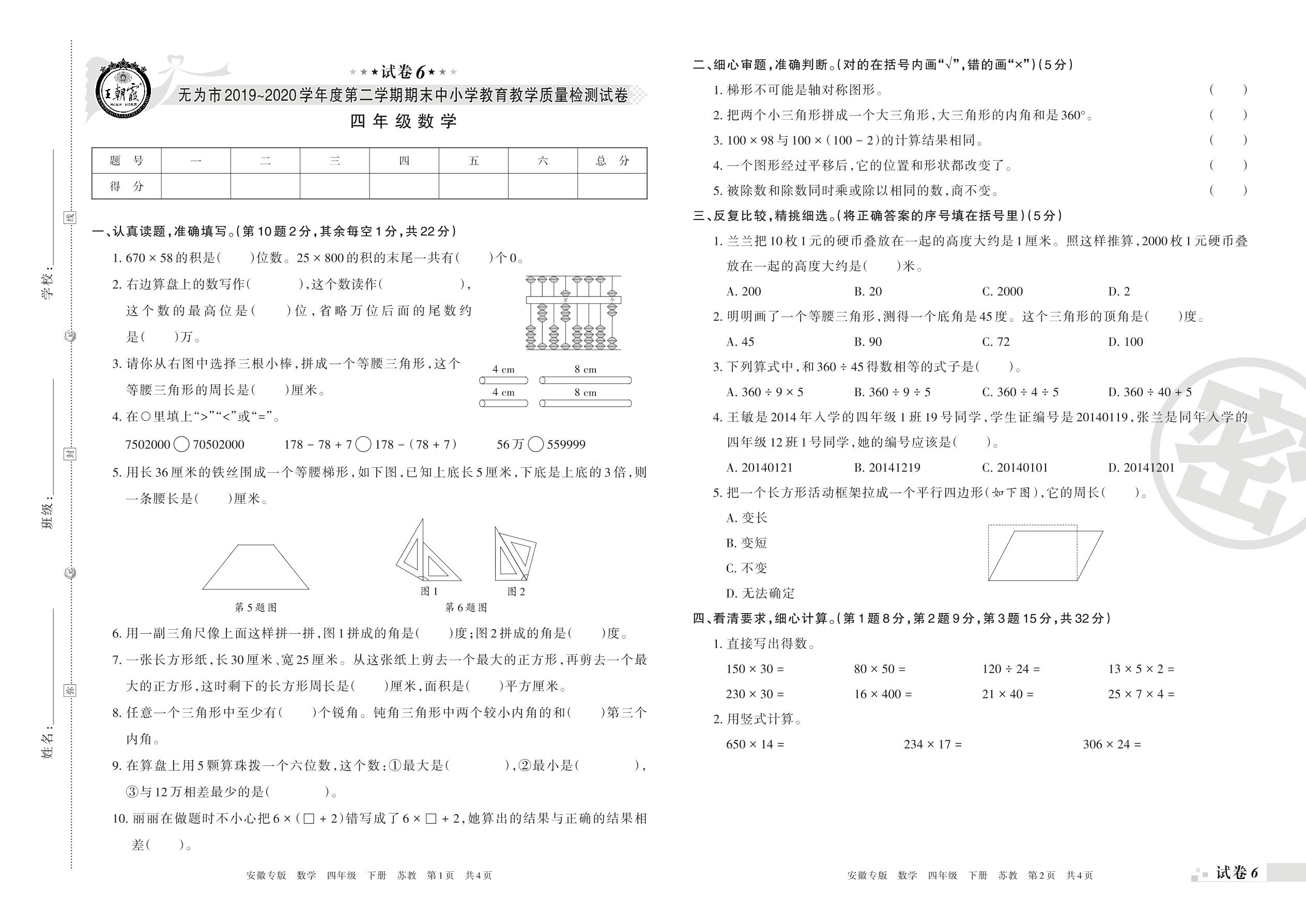 2019-2020学年第二学期无为市四年级数学试卷(苏教版)【6】