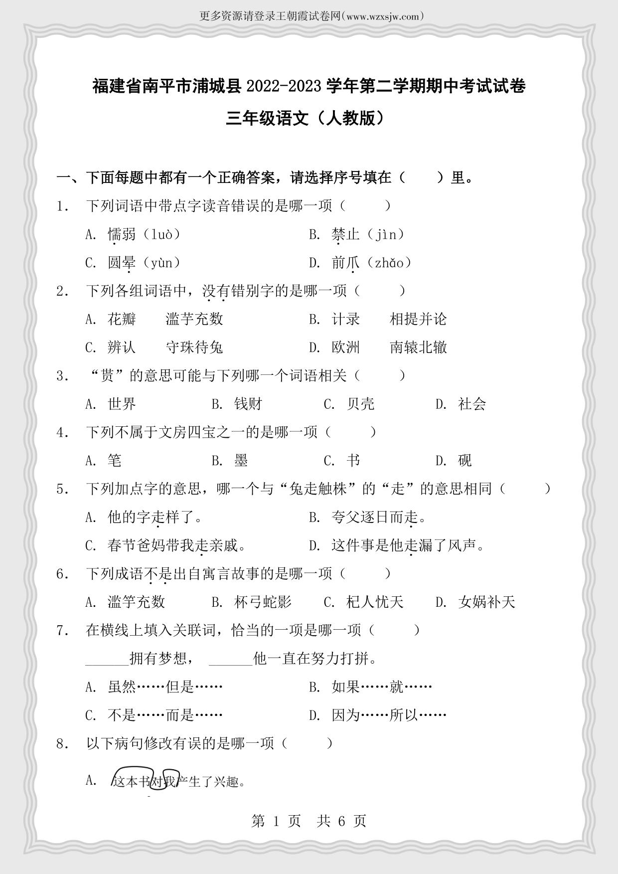 福建省南平市浦城县2022-2023学年第二学期期中考试试卷三年级语文(人教版)