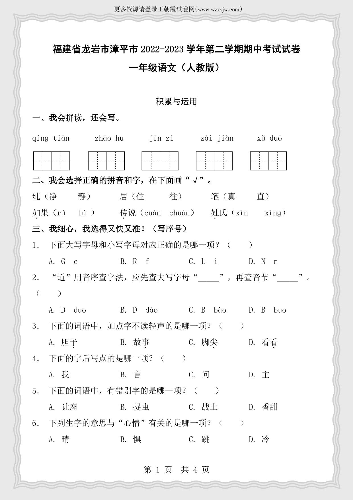 福建省龙岩市漳平市2022-2023学年第二学期期中考试试卷一年级语文(人教版)