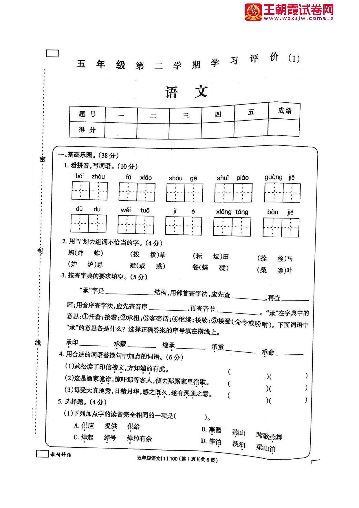 吉林省白城市通榆县育才学校2022-2023学年下学期3月月考试卷五年级语文(人教版)