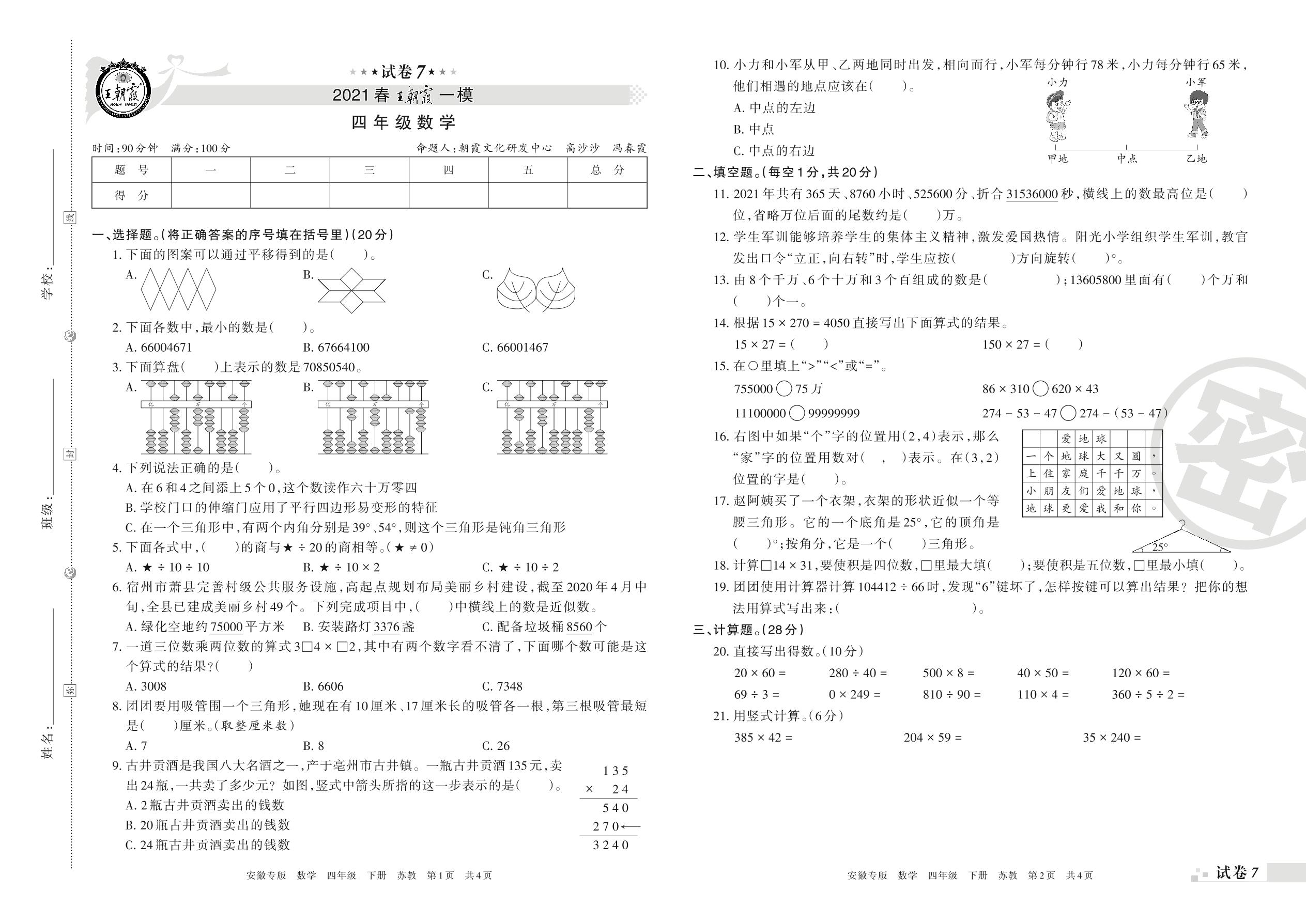 王朝霞期末模拟卷四年级下册数学(苏教版)_R210804134837【7】