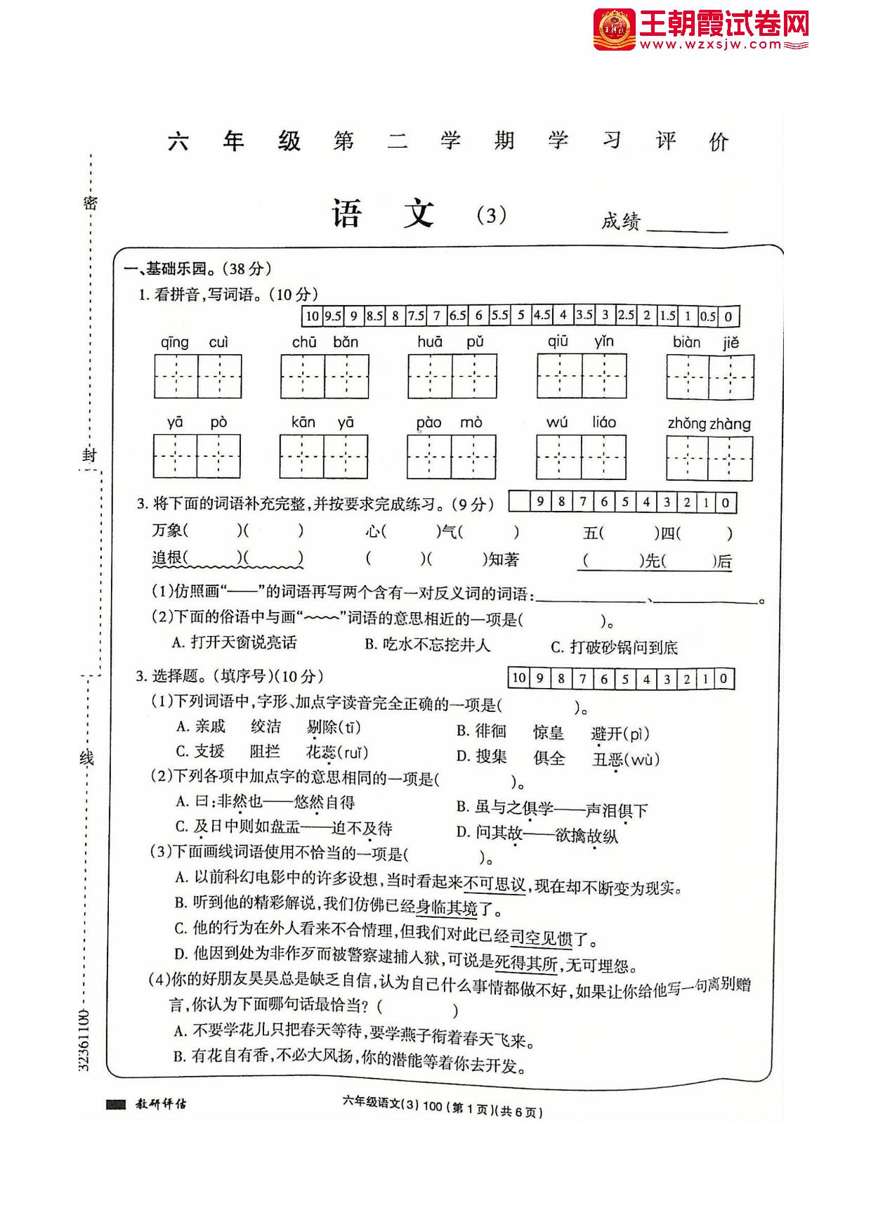 六年级语文人教版下册月考卷