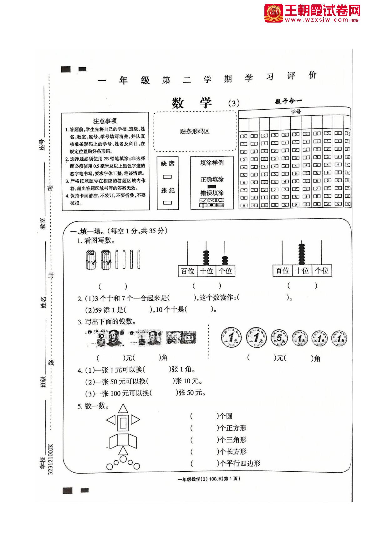 一年级数学人教版下册月考卷