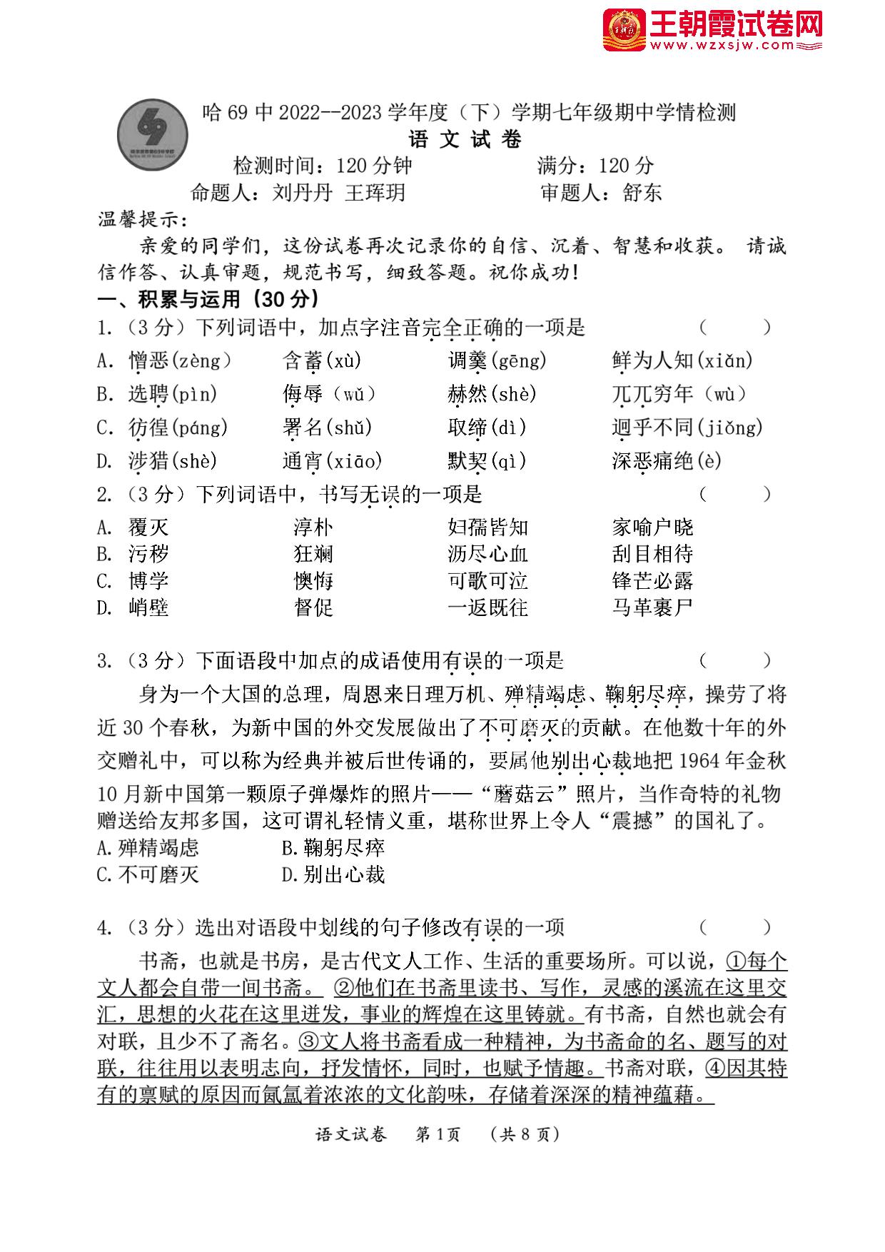 黑龙江省哈尔滨市第六十九中学校2022-2023学年下学期期中学情检测试卷七年级语文(人教版)