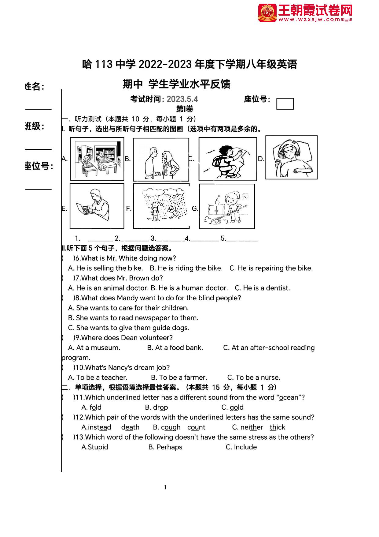 黑龙江省哈尔滨市道里区第一一三中学2022-2023学年下学期期中学生学业水平反馈试卷八年级英语(人教版)【无听力音频】