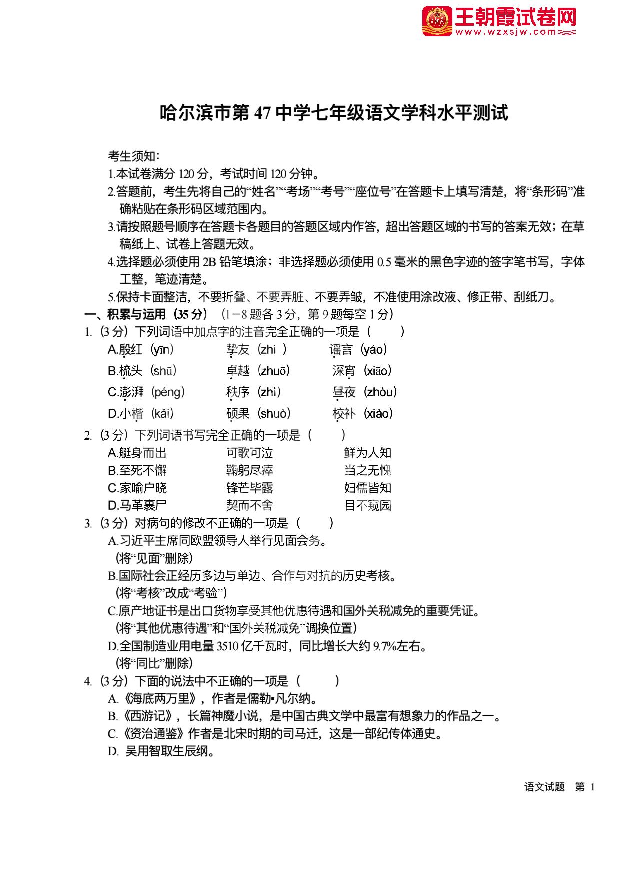 黑龙江省哈尔滨市第四十七中学校2022-2023学年下学期4月月考试卷七年级语文(人教版)