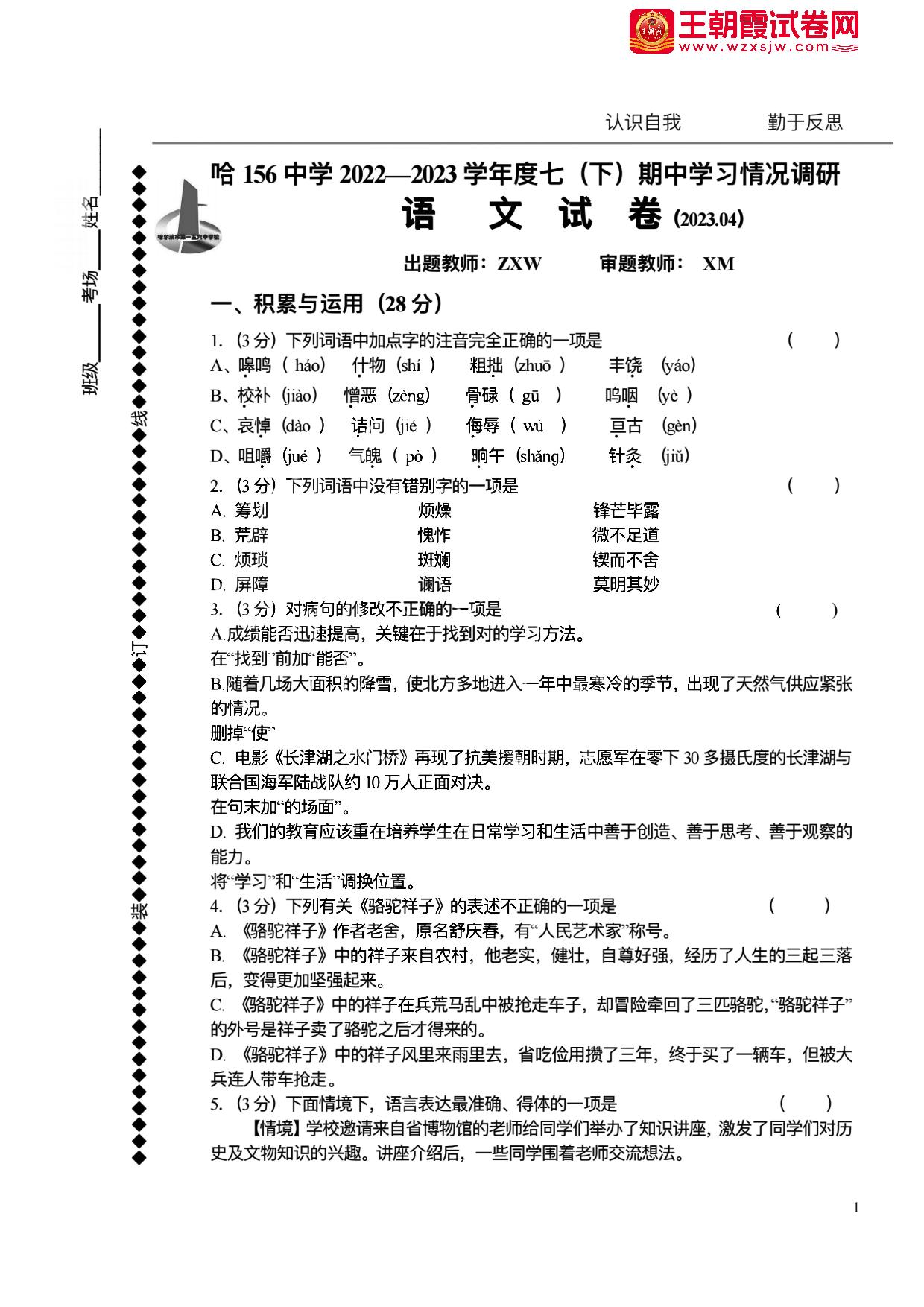 黑龙江省哈尔滨市南岗区第一五六中学2022-2023学年下学期期中学习情况调研试卷七年级语文(人教版)