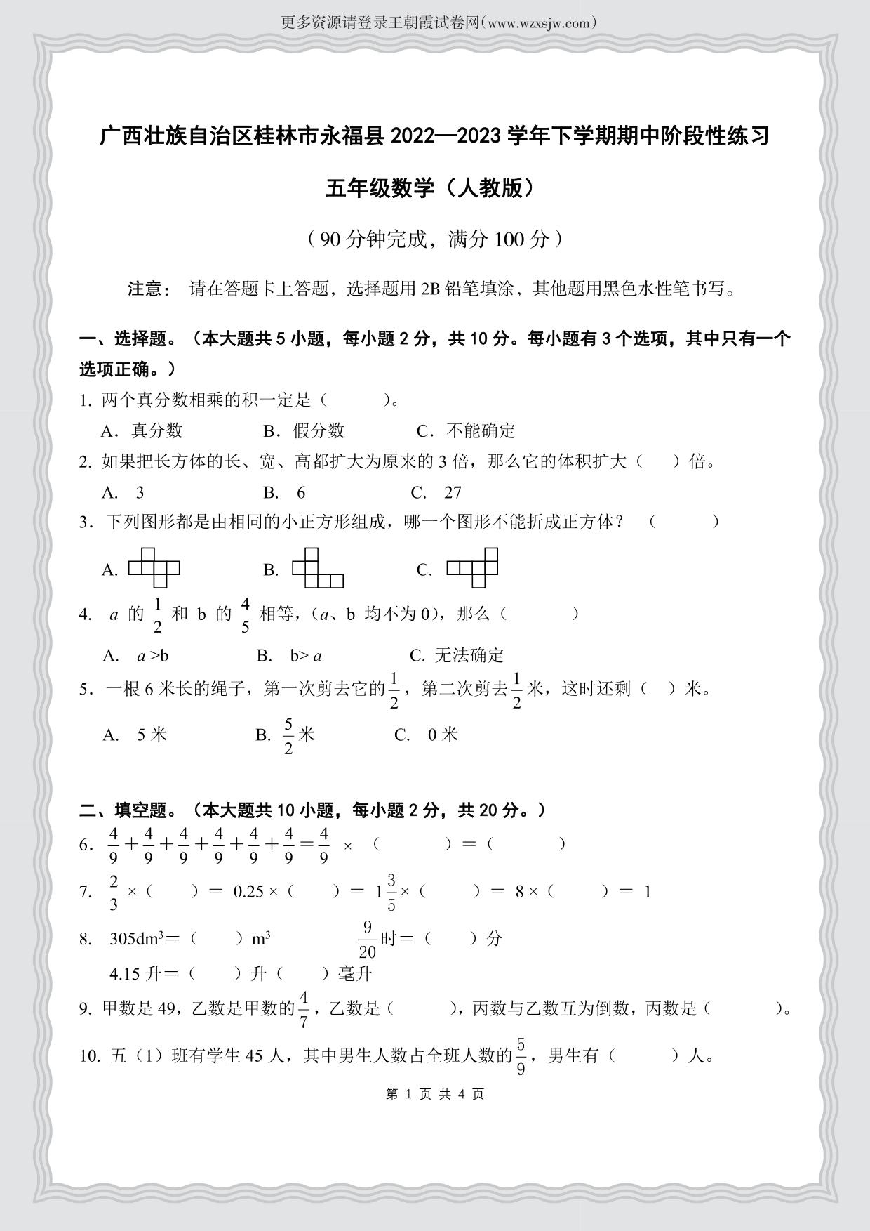 广西壮族自治区桂林市永福县2022—2023学年下学期期中阶段性练习五年级数学(人教版)