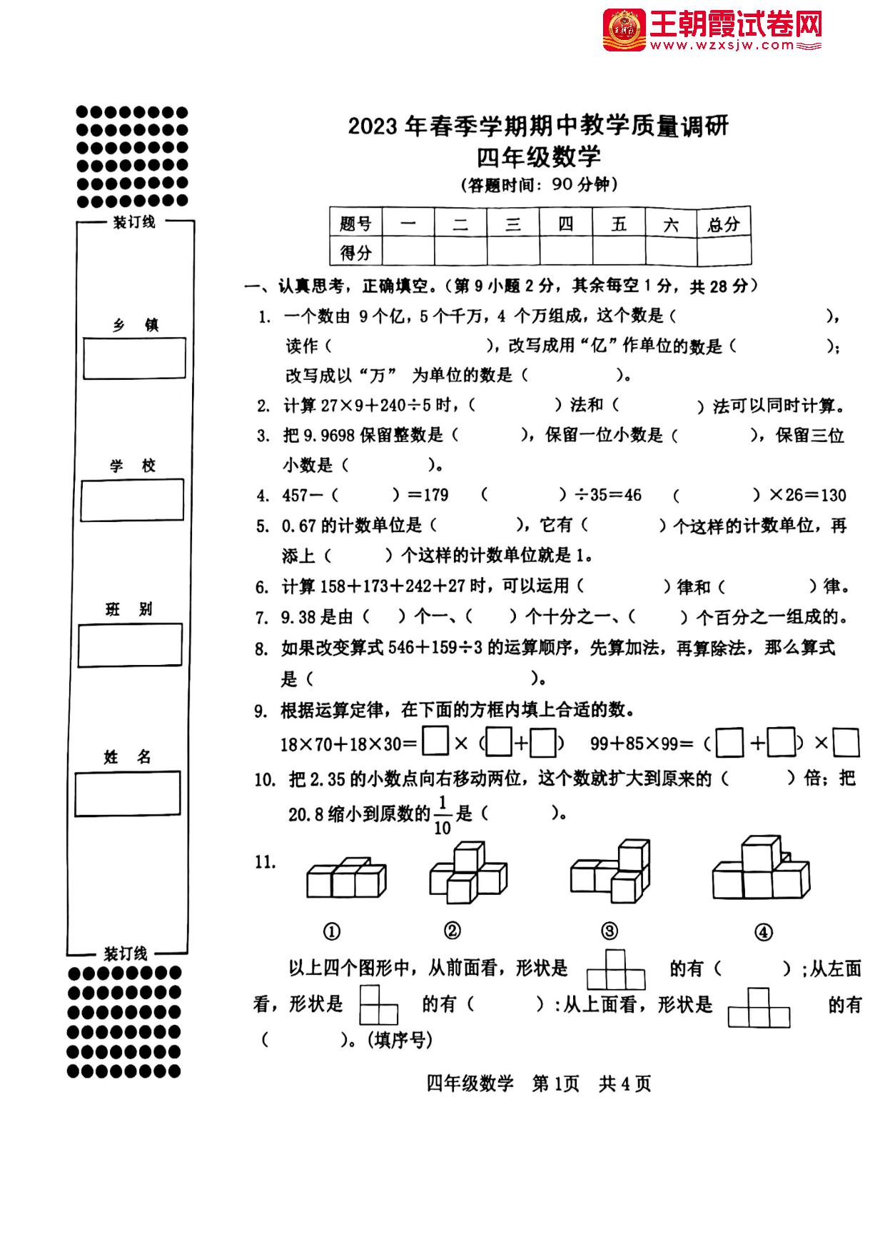 广西壮族自治区河池市都安瑶族自治县2022—2023学年下学期期中教学质量调研四年级数学(人教版)