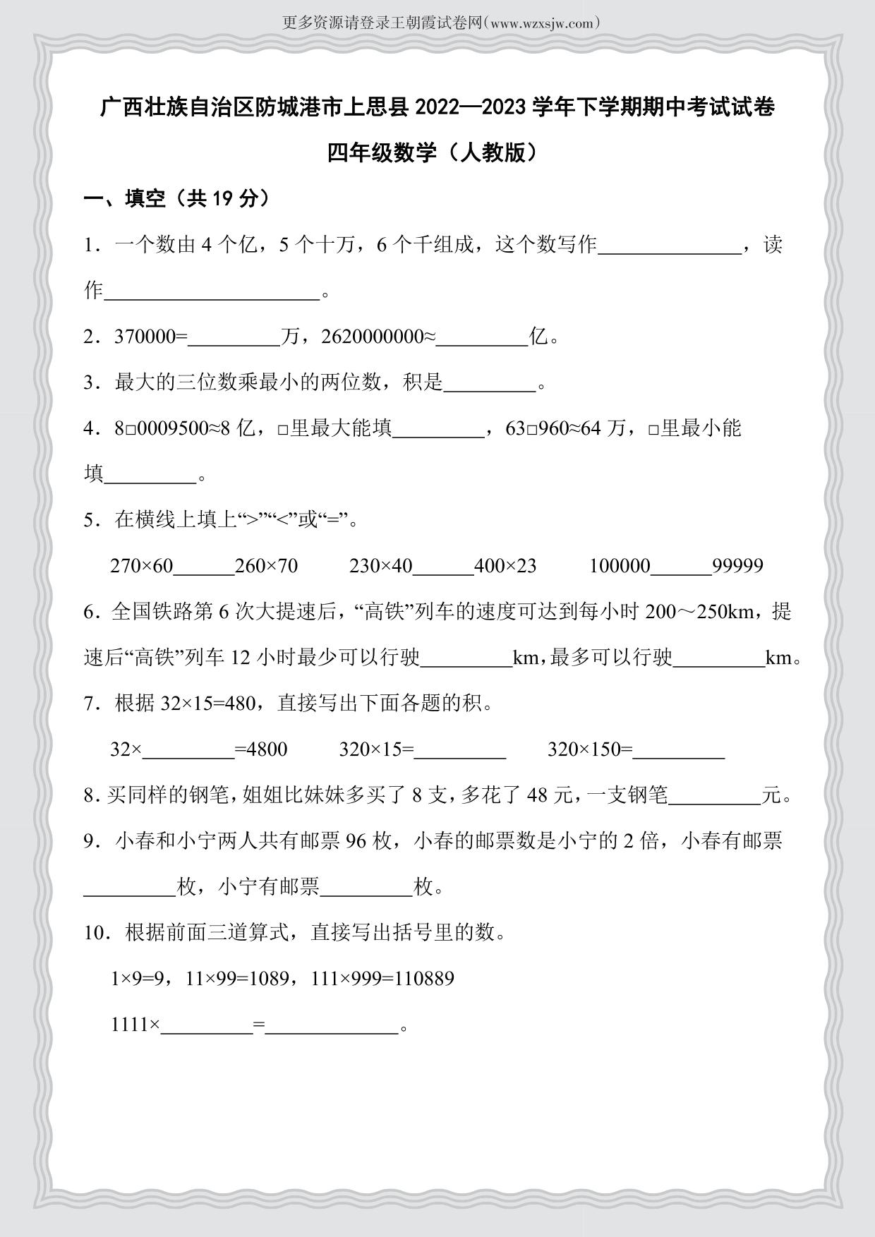 广西壮族自治区防城港市上思县2022—2023学年下学期期中考试试卷四年级数学(人教版)