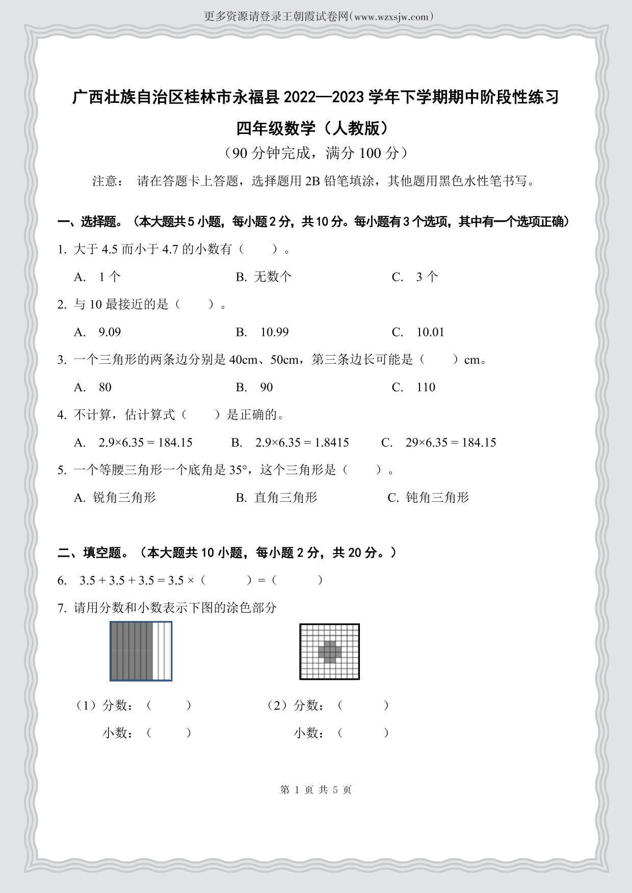 广西壮族自治区桂林市永福县2022—2023学年下学期期中阶段性练习四年级数学(人教版)