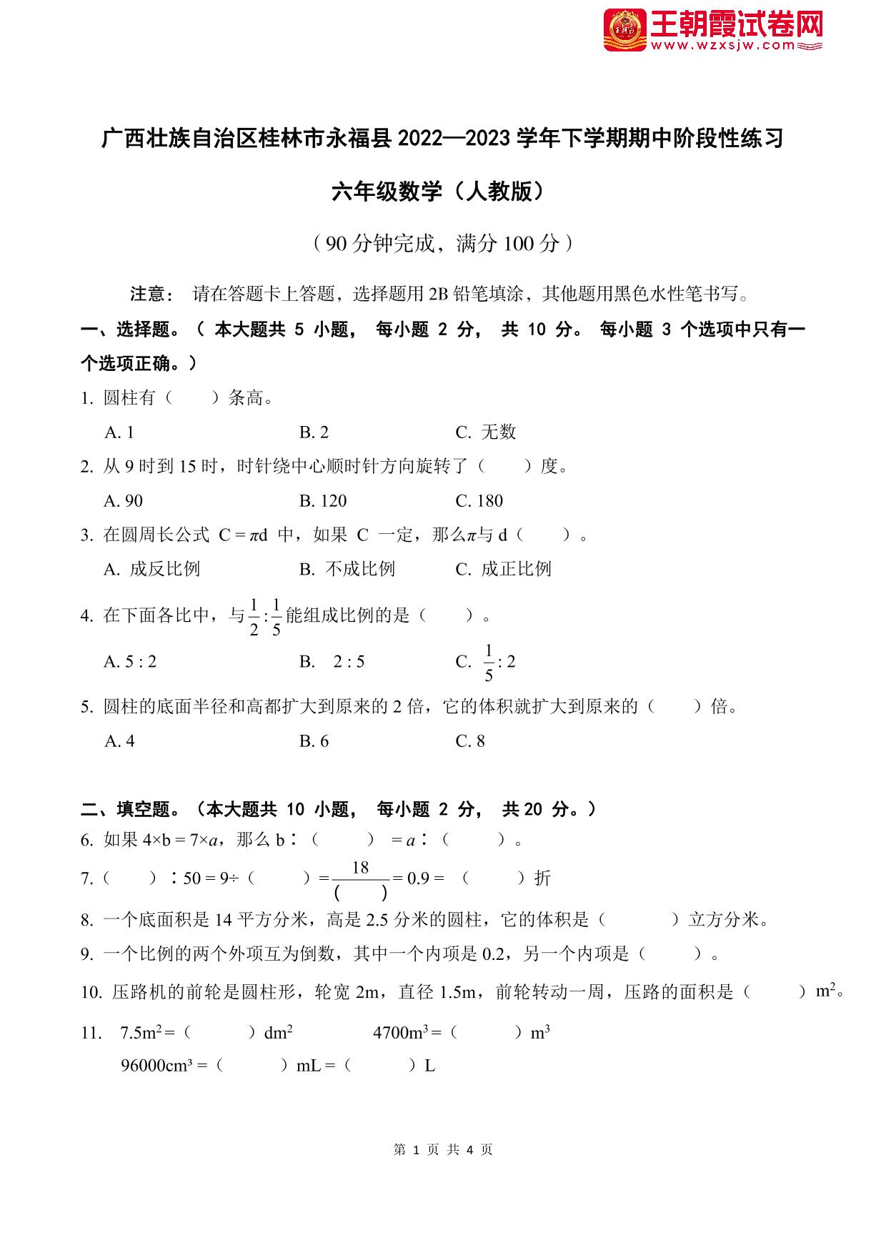广西壮族自治区桂林市永福县2022—2023学年下学期期中阶段性练习六年级数学(人教版)