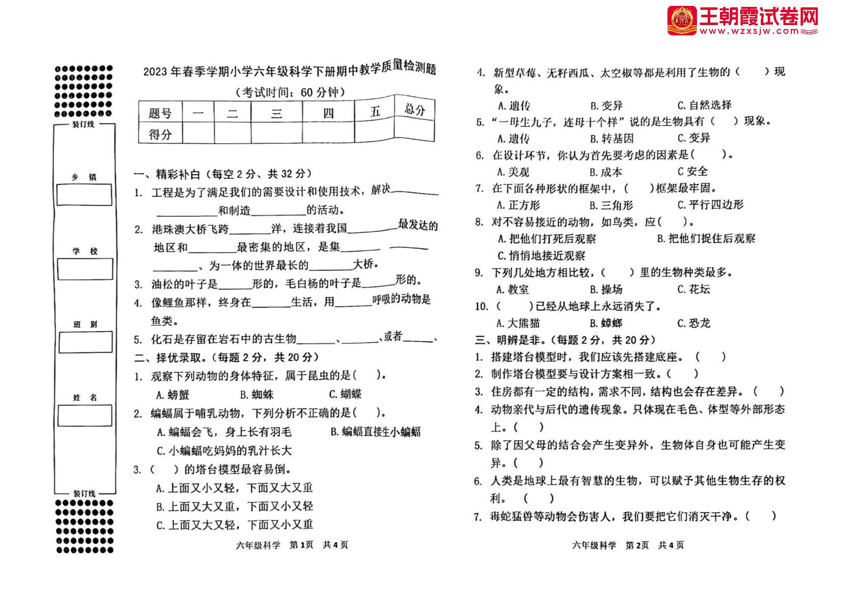 广西壮族自治区河池市都安瑶族自治县2022—2023学年下学期期中教学质量检测题六年级科学(人教版)