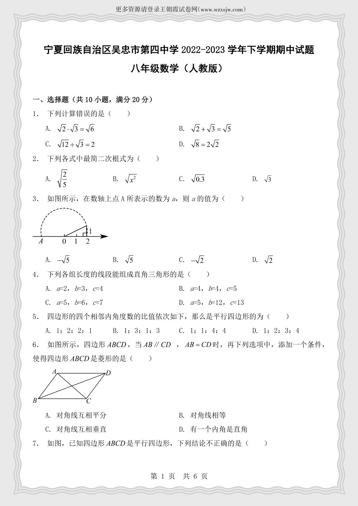 宁夏回族自治区吴忠市第四中学2022-2023学年下学期期中试题八年级数学(人教版)