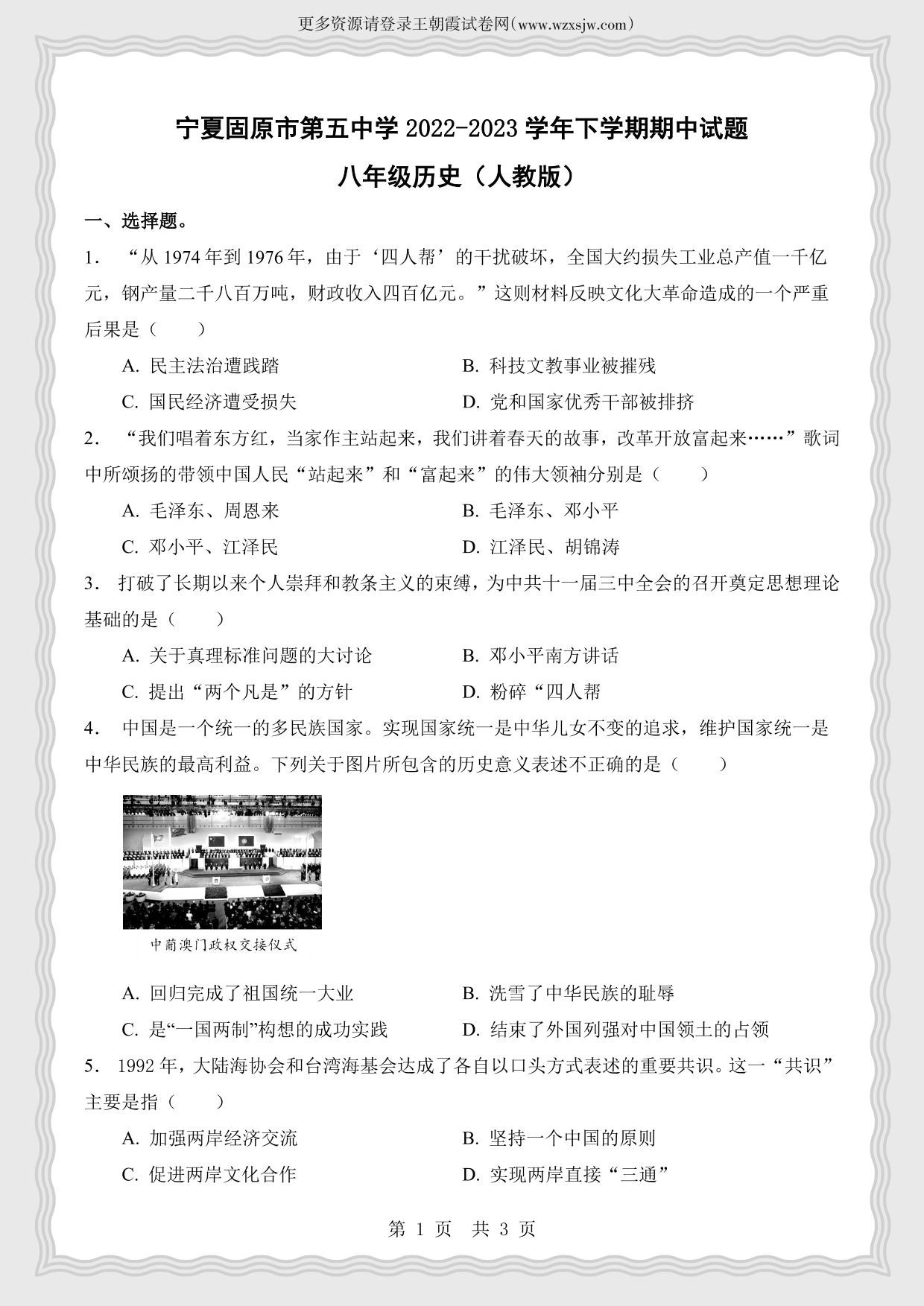 宁夏固原市第五中学2022-2023学年下学期期中试题八年级历史(人教版)
