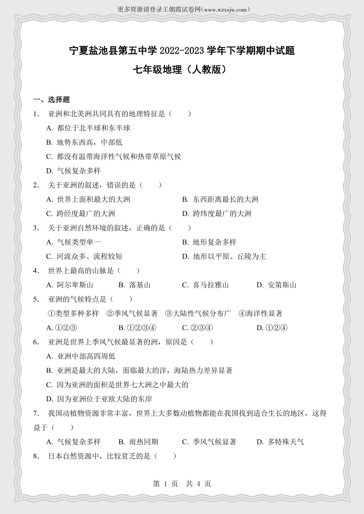 宁夏盐池县第五中学2022-2023学年下学期期中试题七年级地理(人教版)