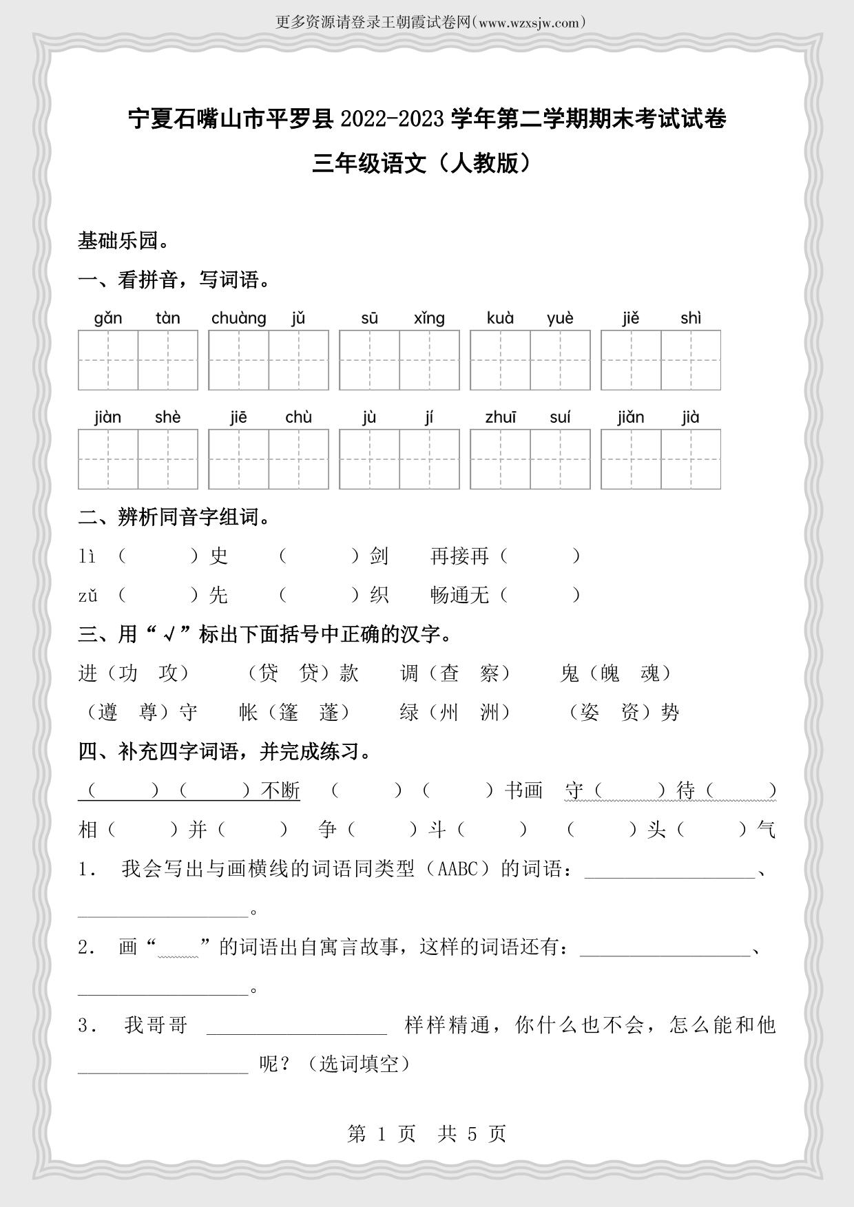 宁夏石嘴山市平罗县2022-2023学年第二学期期末考试试卷三年级语文(人教版)