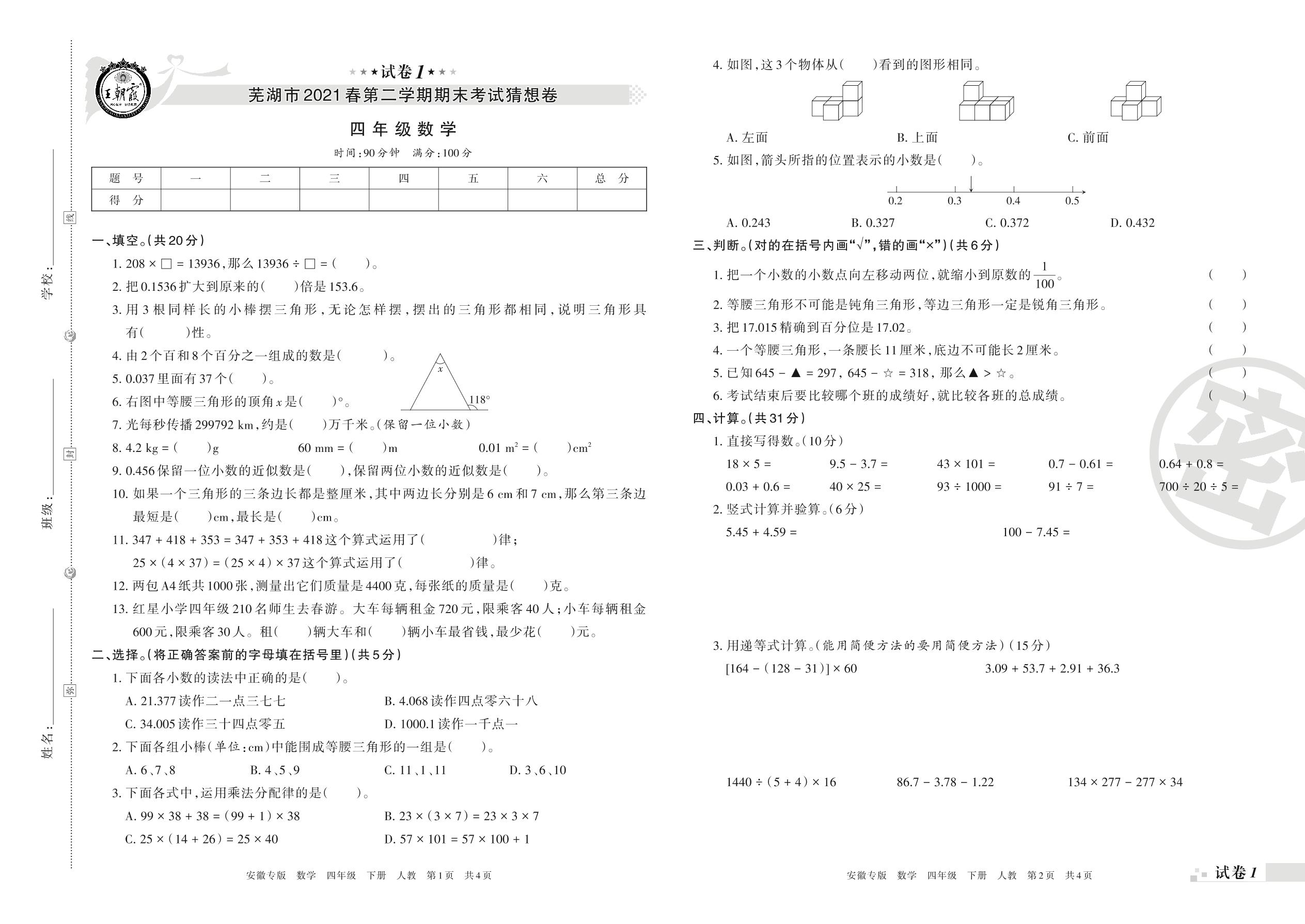2019-2020学年第二学期芜湖市四年级数学试卷(人教版)【1】