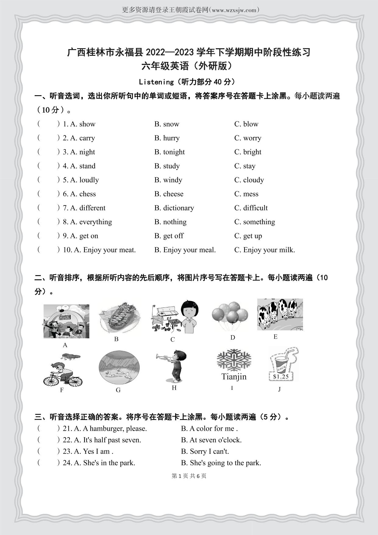 广西桂林市永福县2022—2023学年下学期期中阶段性练习六年级英语(外研版)