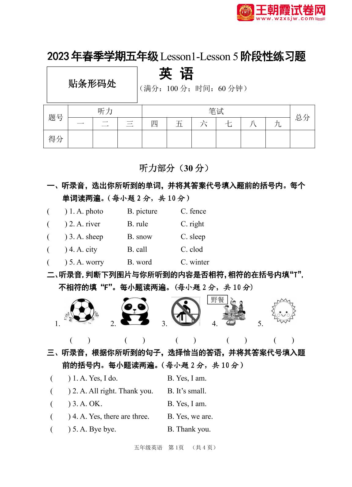 广西壮族自治区贺州市八步区2022—2023学年下学期期中阶段性练习题五年级英语(接力版)【无听力音频】