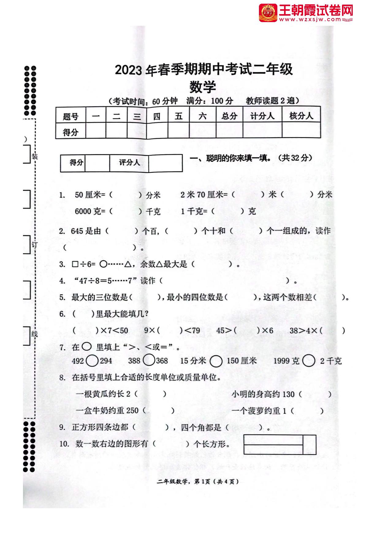 广西壮族自治区贵港市港南区2022—2023学年下学期期中检测试题二年级数学(人教版)