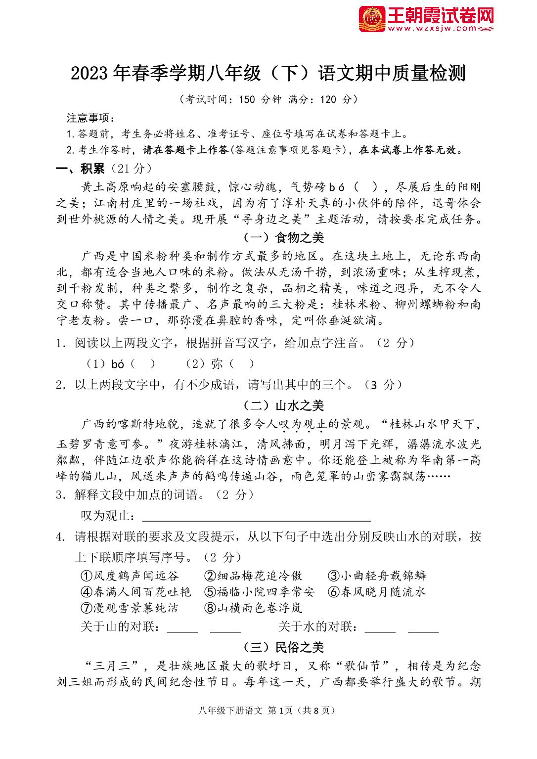 广西壮族自治区北海市银海区2022—2023学年下学期期中质量检测八年级语文(人教版)