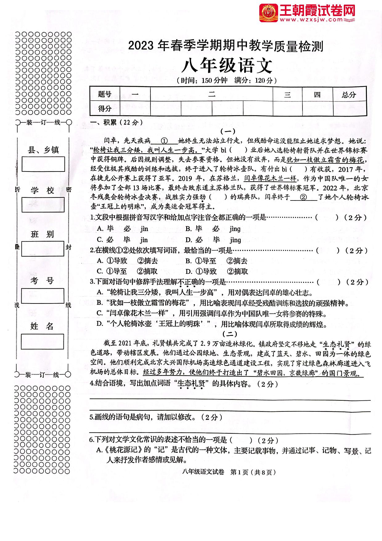 八年级语文人教版下册期中卷