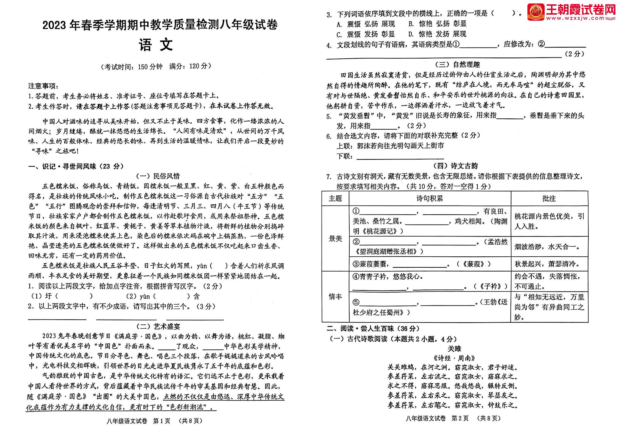 广西壮族自治区贺州市平桂区2022-2023学年下学期期中教学质量检测八年级语文(人教版)