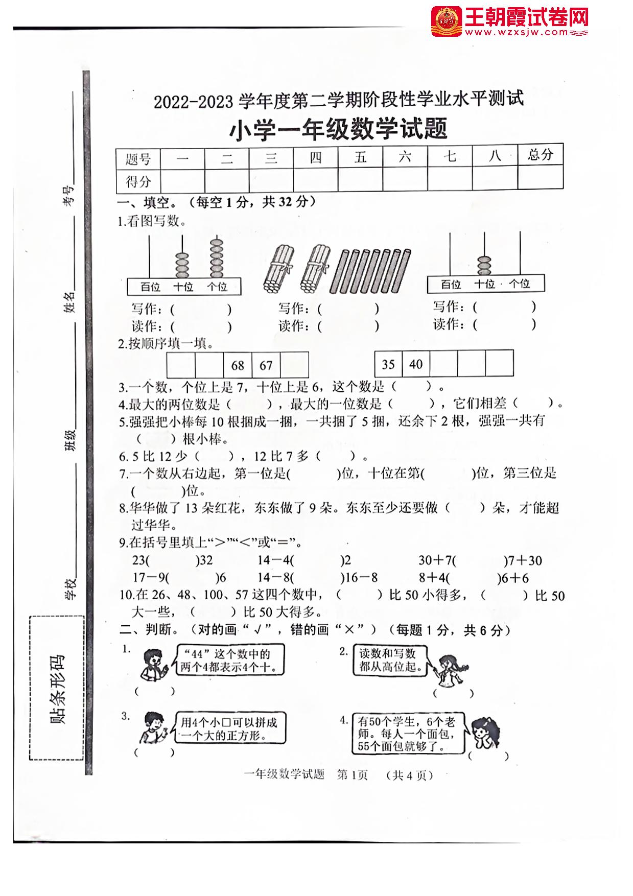 山东省菏泽市鄄城县2022-2023学年度第二学期阶段性学业水平测试一年级数学(人教版)