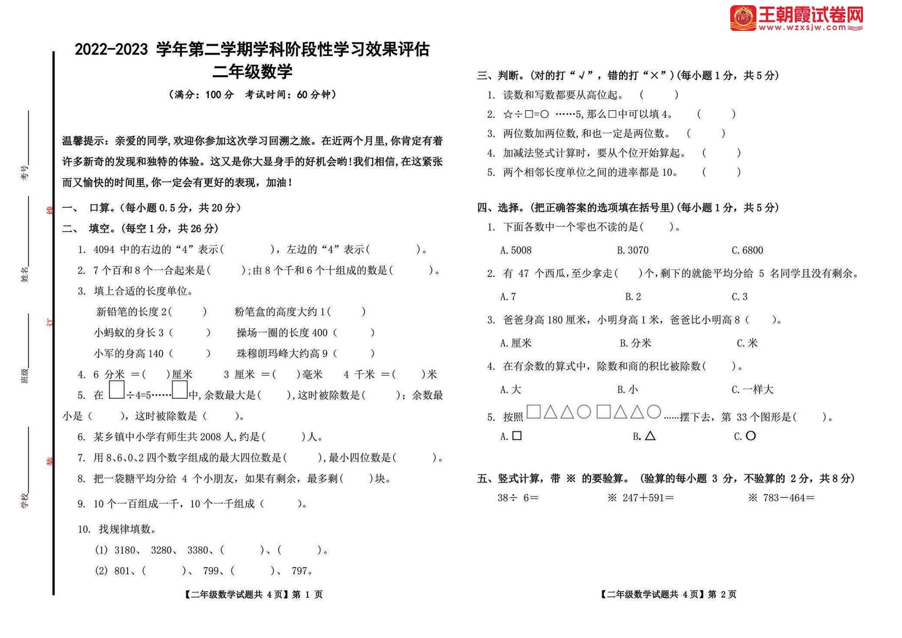 山东省德州市武城县2022-2023学年第二学期(期中)阶段性学习效果评估二年级数学(青岛版)