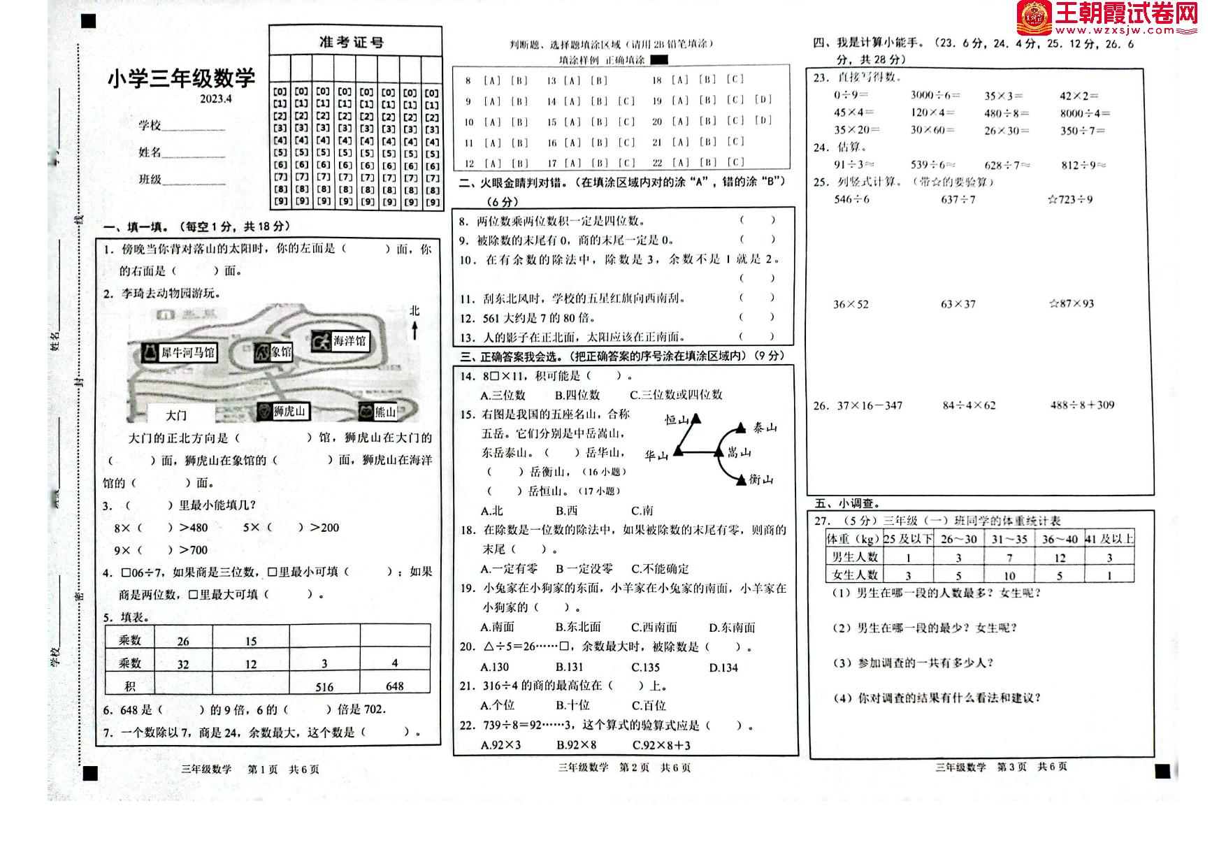 山东省菏泽市牡丹区2022-2023学年下学期期中试题三年级数学(人教版)