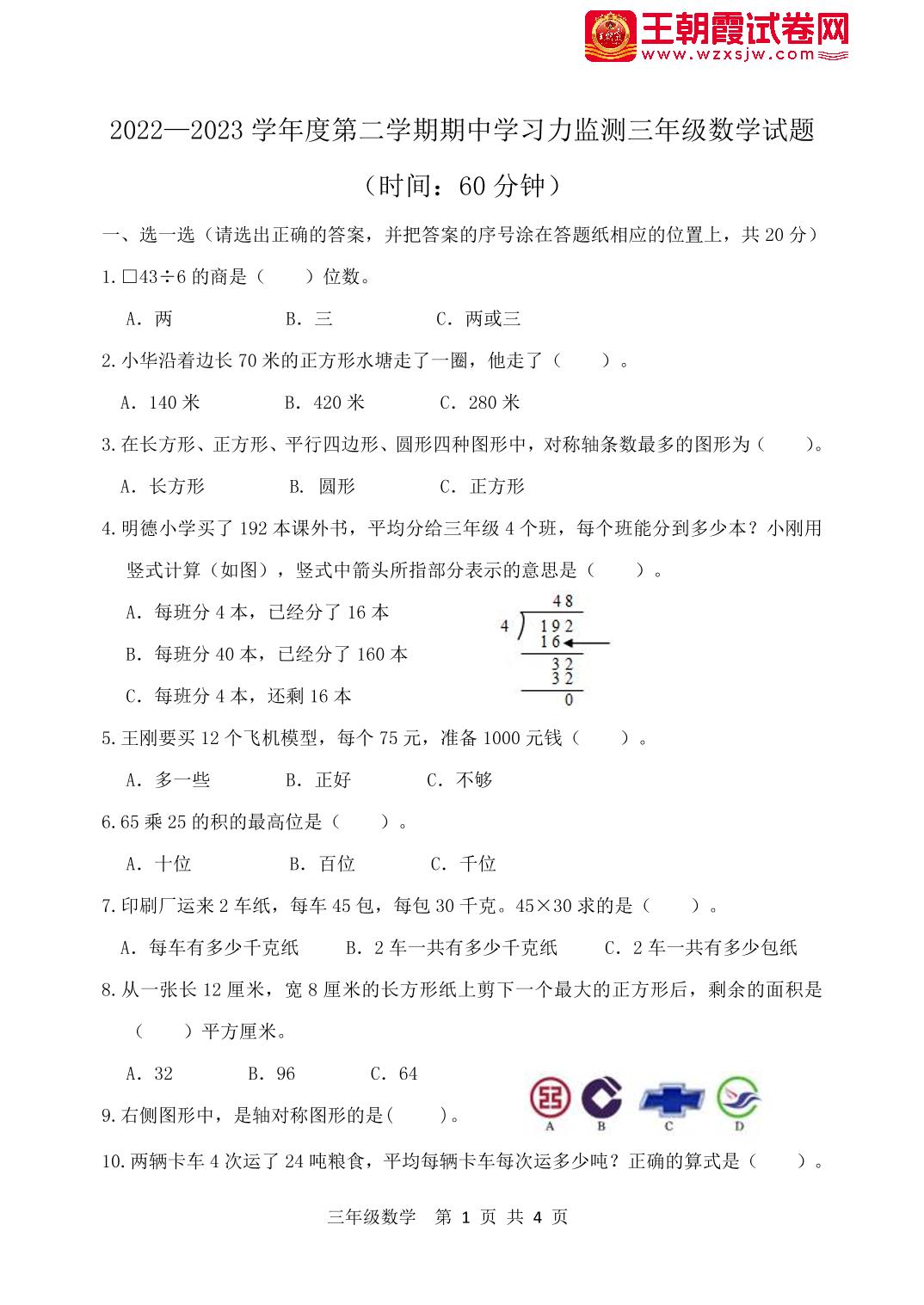 山东省滨州市阳信县2022-2023学年度第二学期期中学习力监测三年级数学(青岛版)