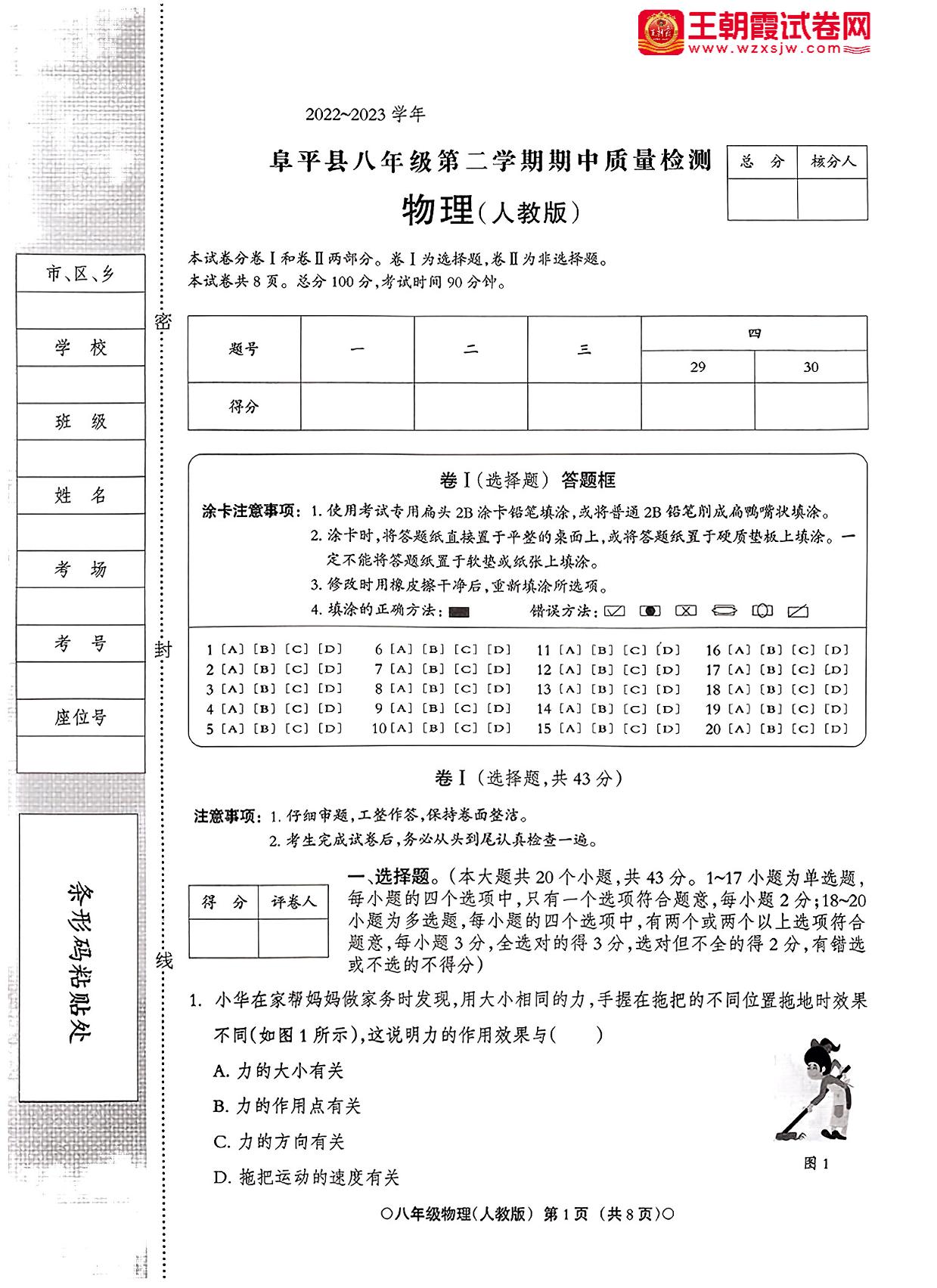 河北省保定市阜平县2022-2023学年第二学期期中质量检测八年级物理(人教版)