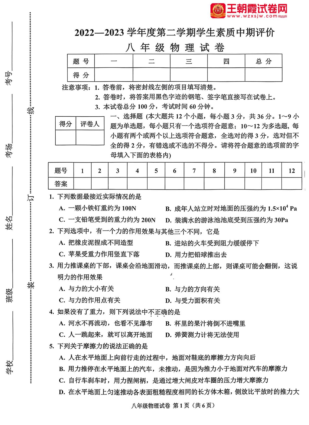 八年级物理教科版下册期中卷