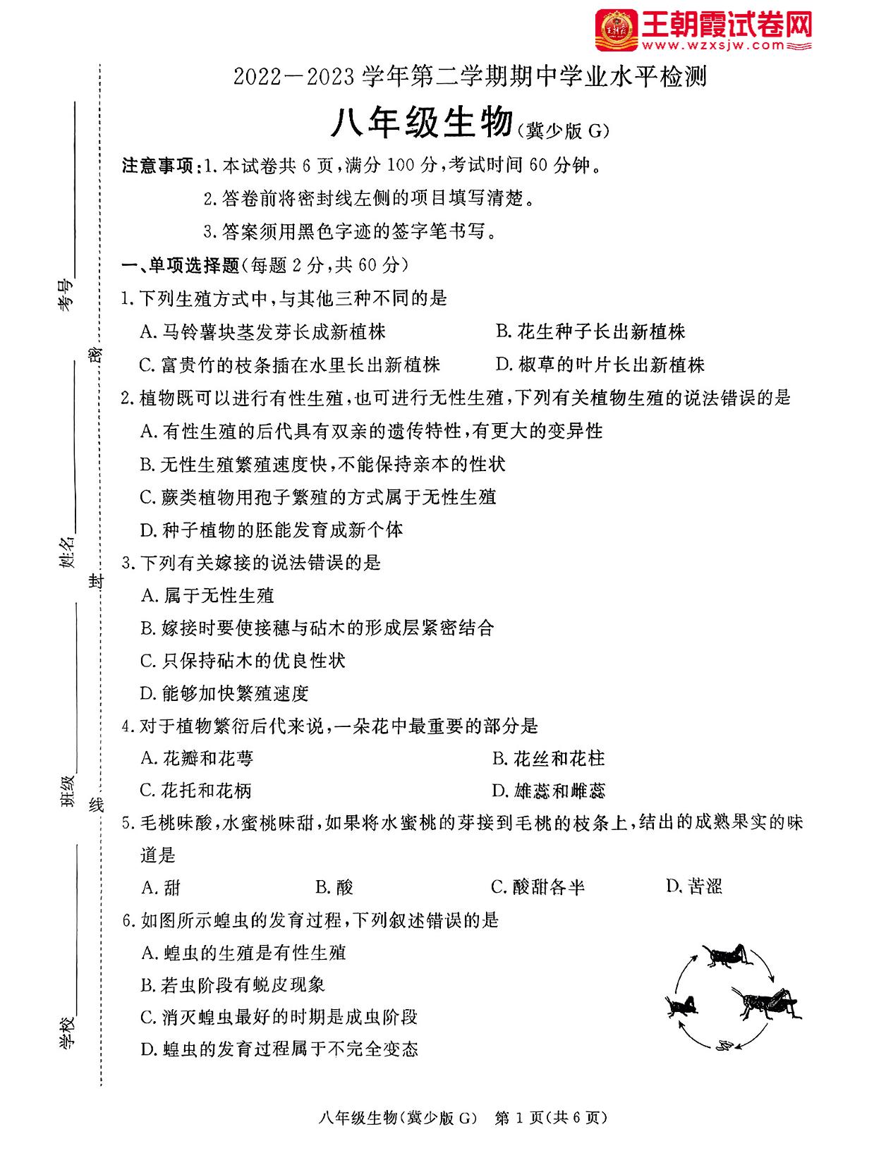 河北省保定市高碑店市2022-2023学年第二学期期中学业水平检测八年级生物(冀少版)