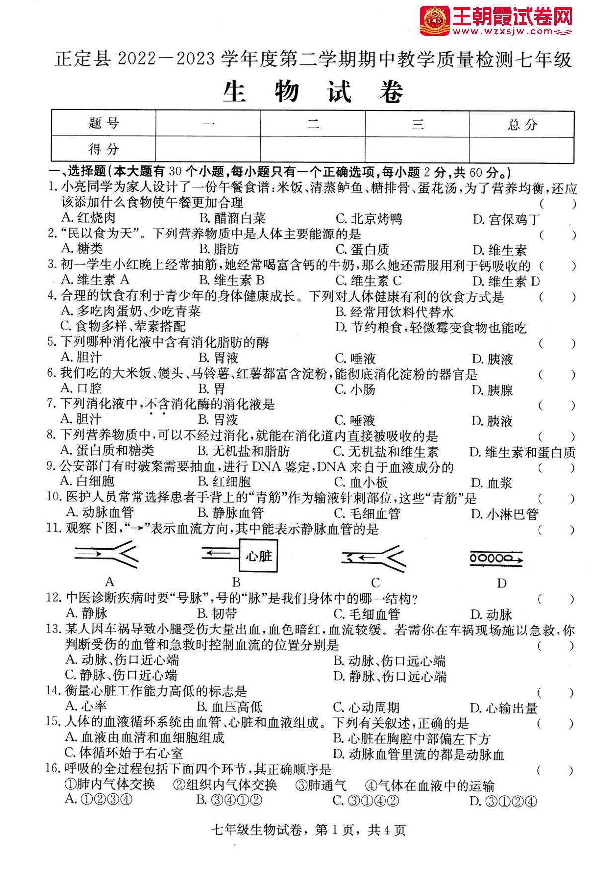 河北省石家庄市正定县2022-2023学年度第二学期期中教学质量检测试卷七年级生物(人教版)