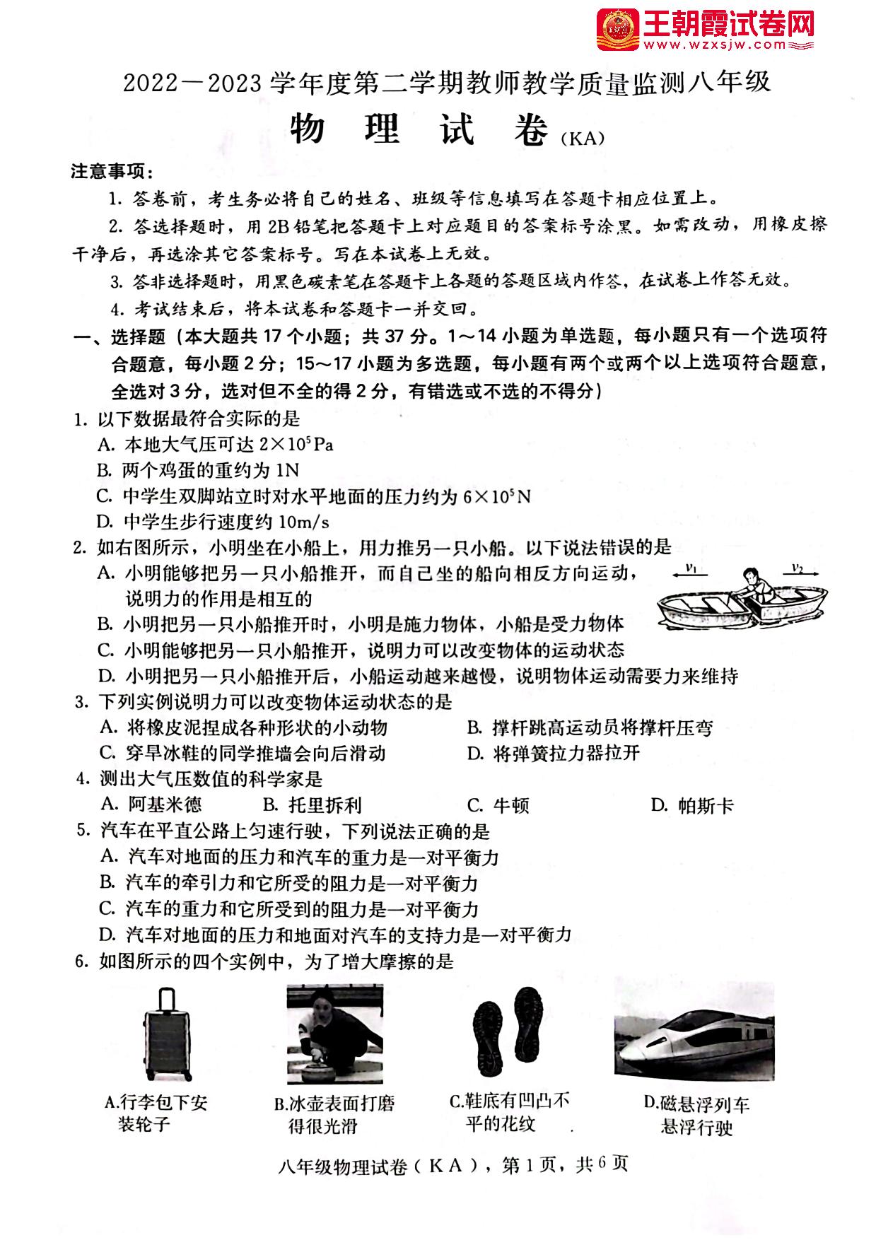 河北省石家庄市赵县2022-2023学年度第二学期教师教学质量监测期中试卷八年级物理(人教版)