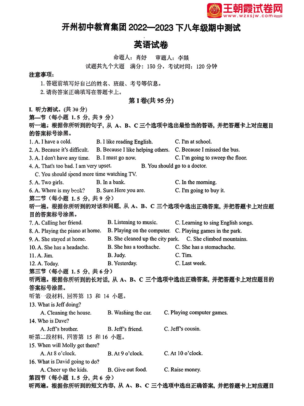 重庆市开州区初中教育集团2022-2023学年下学期期中测试试卷八年级英语(人教版)【无听力音频】