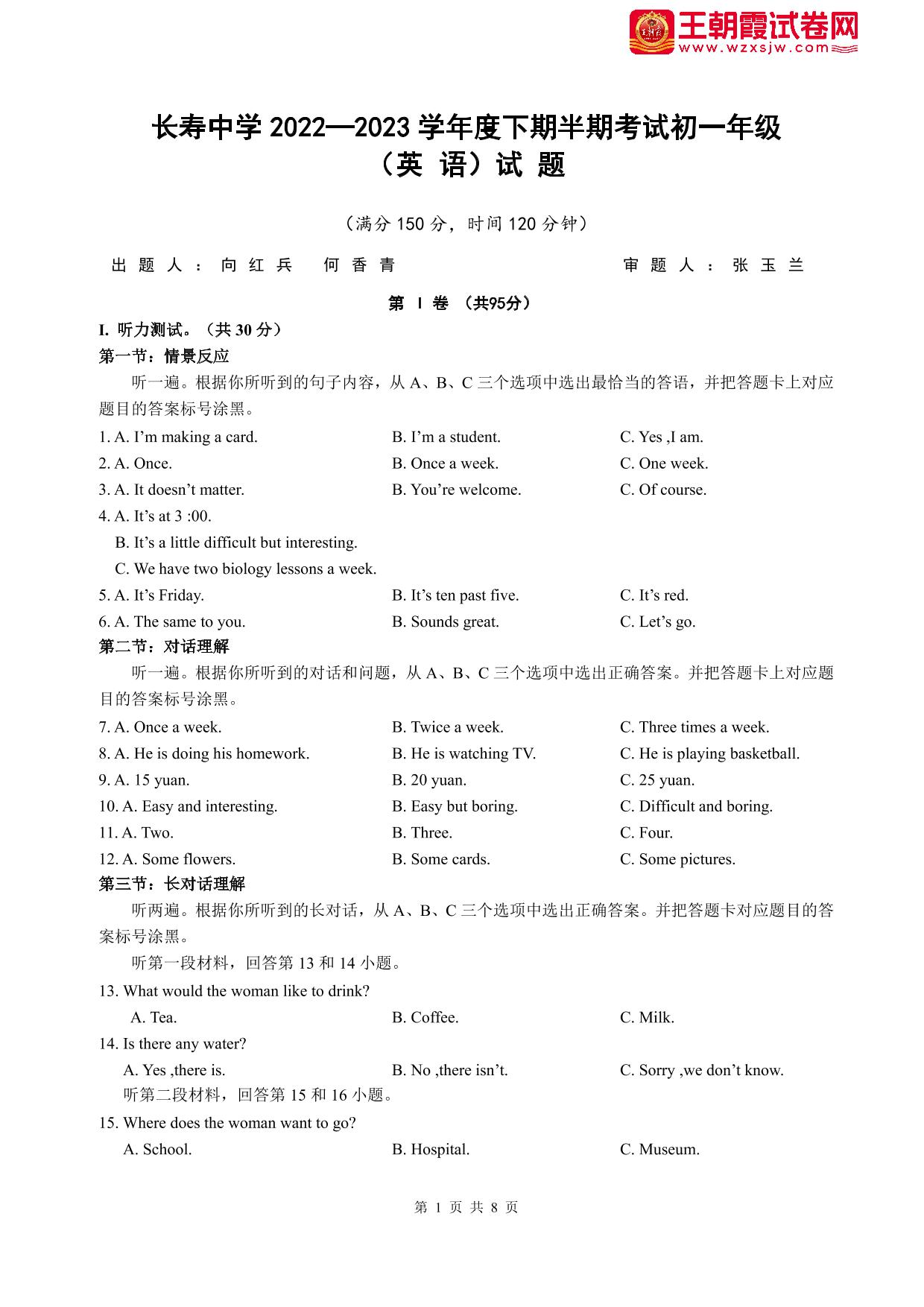 重庆市长寿中学2022-2023学年度下学期期中考试试题七年级英语(新课标版)
