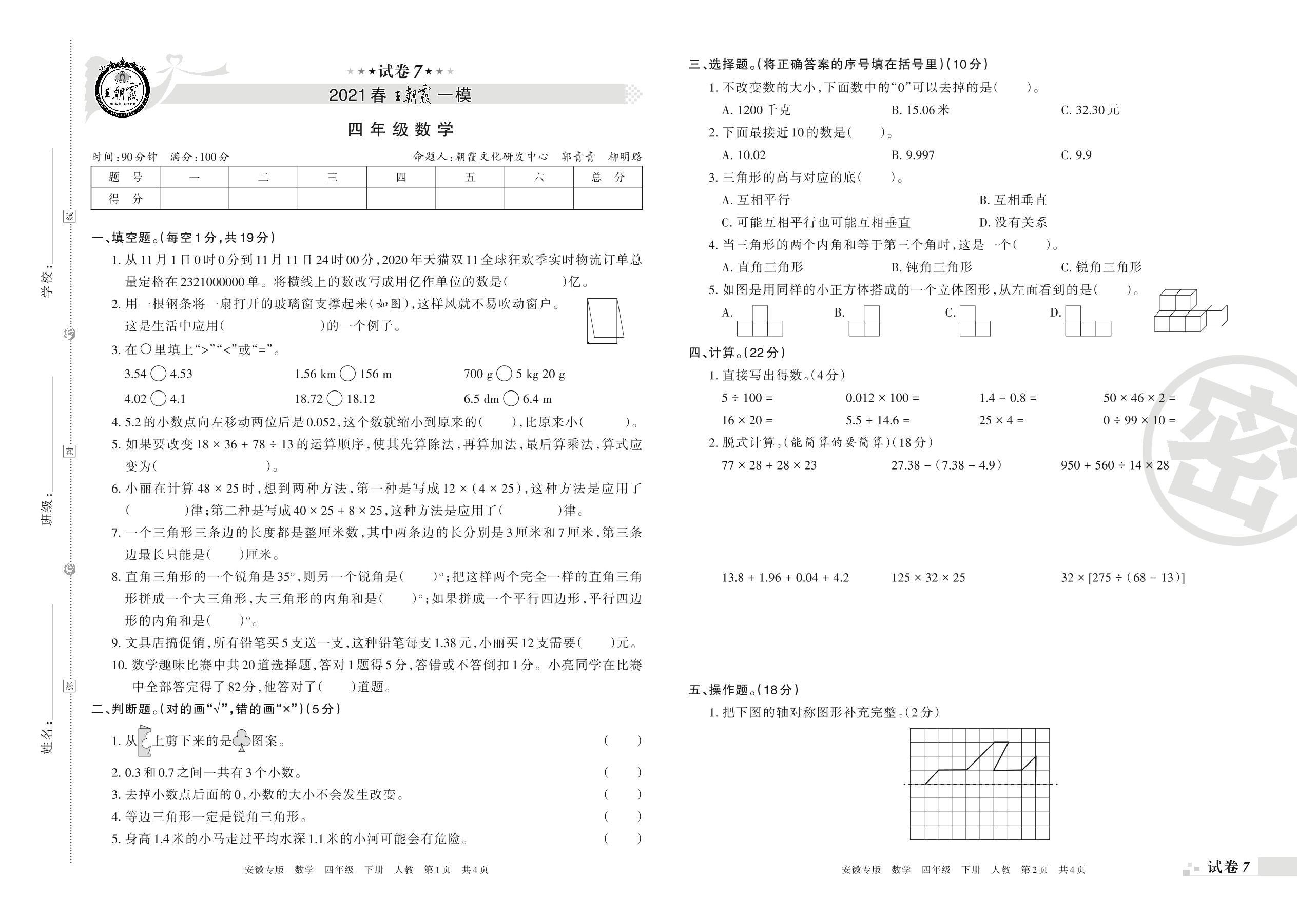 王朝霞期末模拟卷四年级下册数学(人教版)_R210804134941【7】
