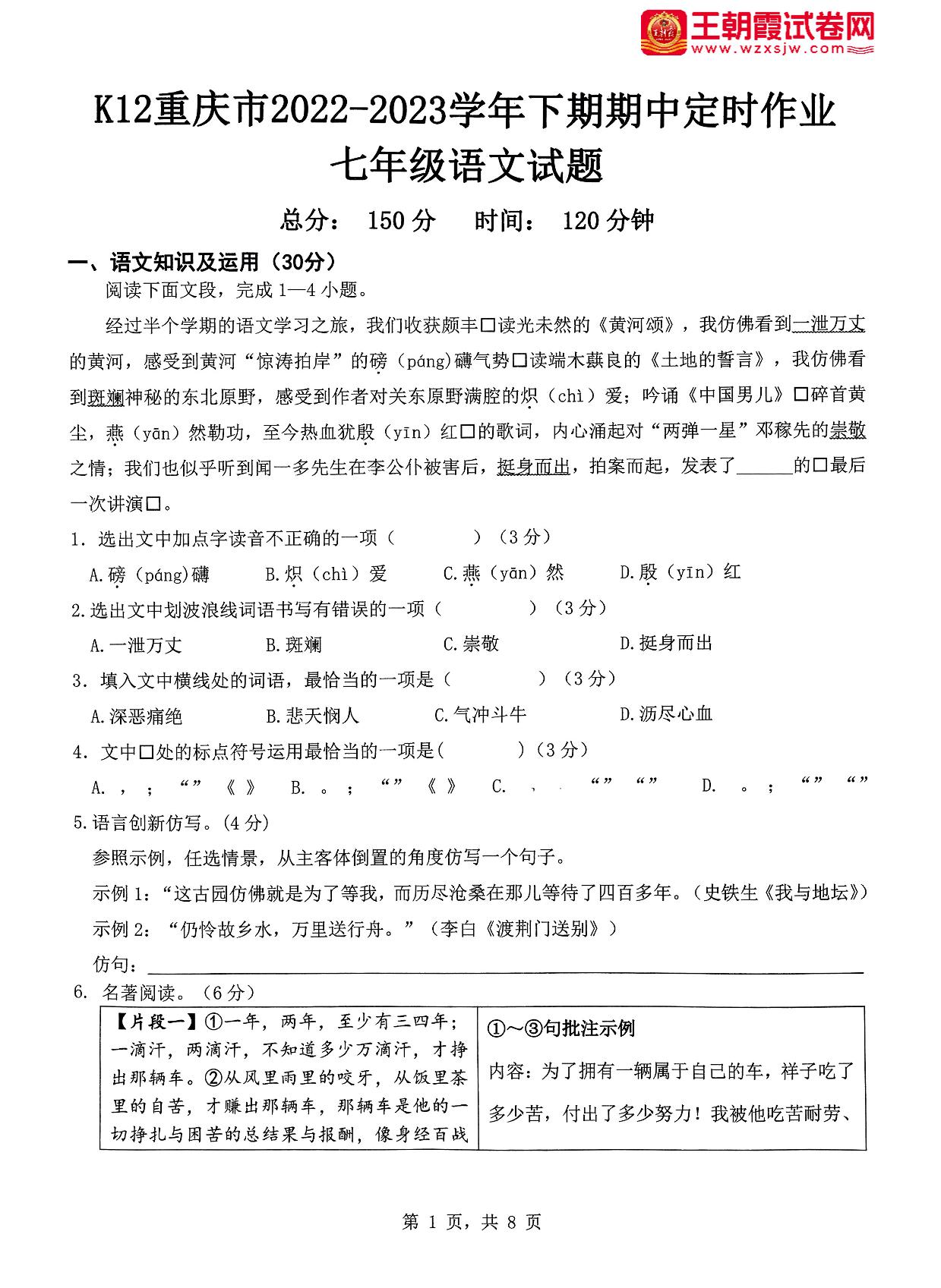 重庆市巴南区2022-2023学年下学期期中定时作业试题七年级语文(人教版)