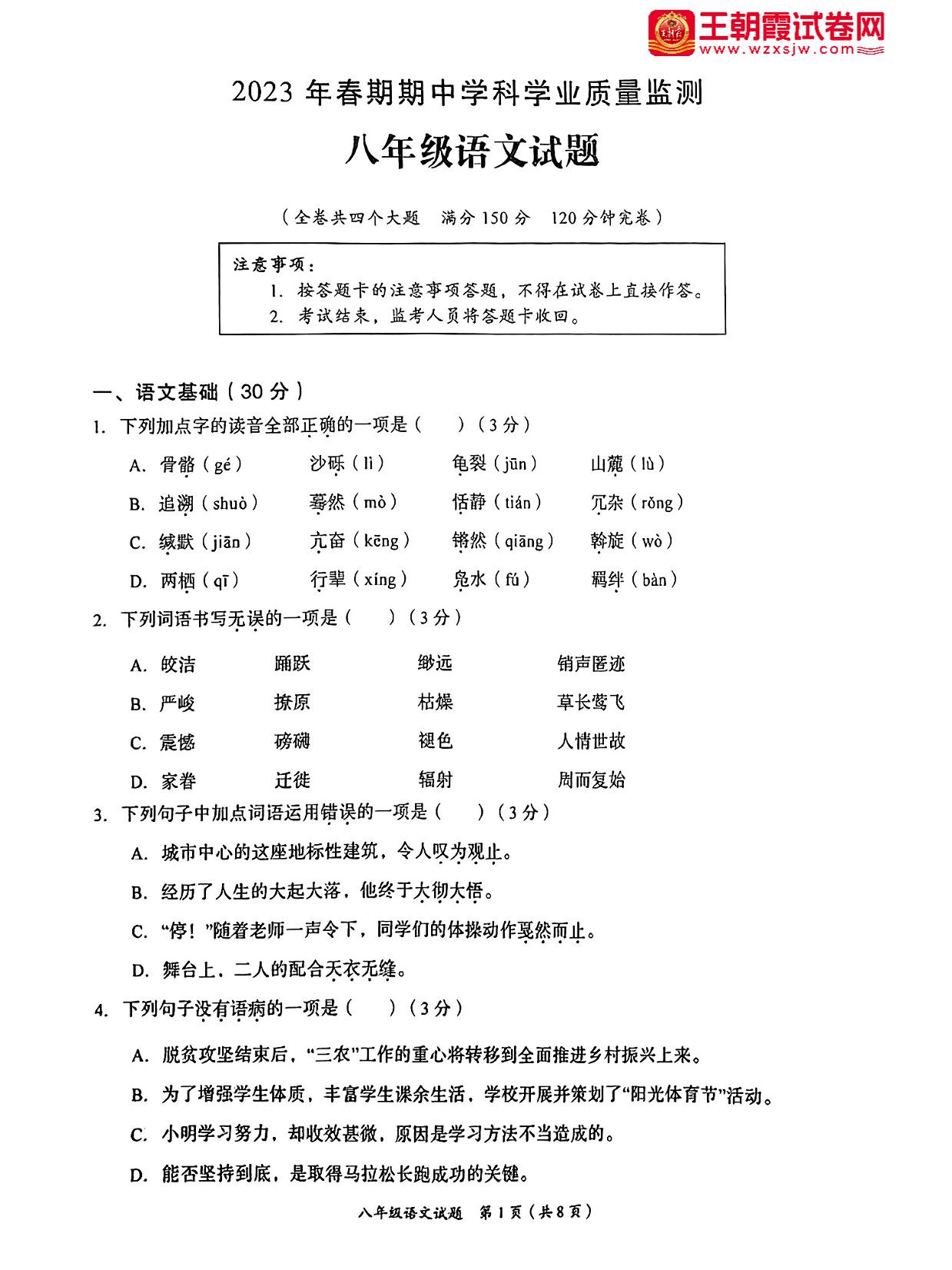 重庆市南川区2023年春期期中学科学业质量监测试题八年级语文(人教版)