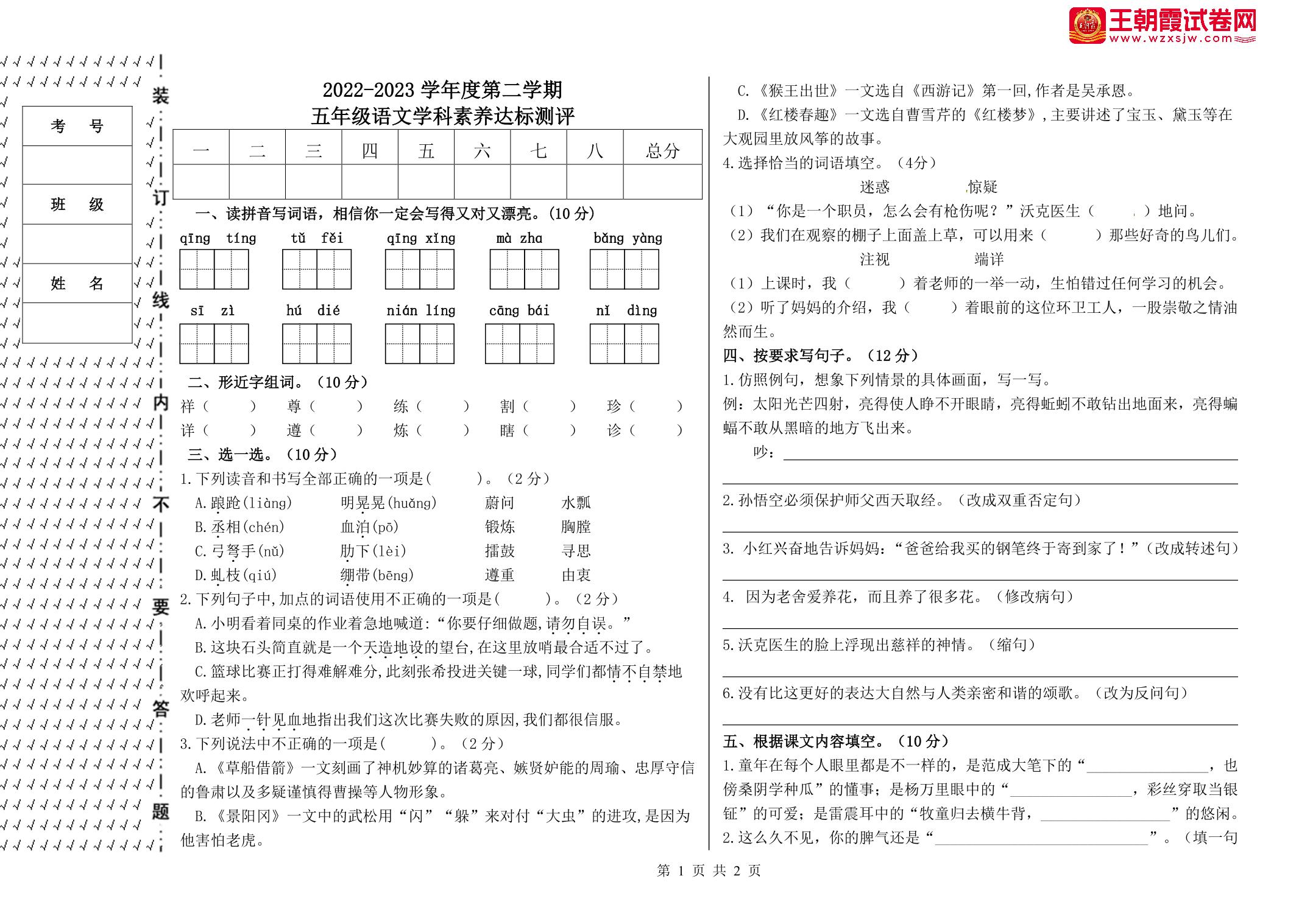 五年级语文人教版下册期中卷