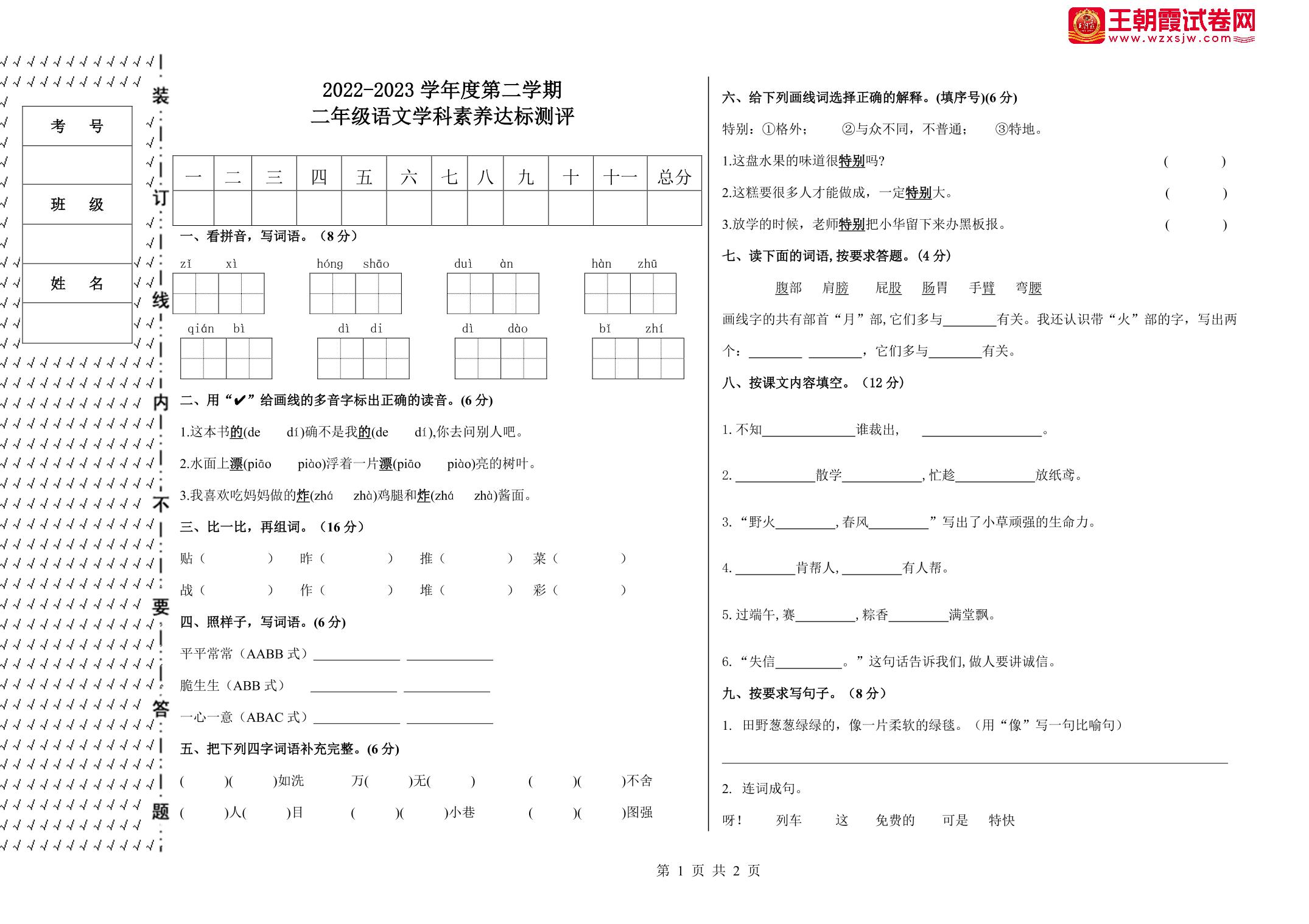 黑龙江省佳木斯市同江市六校联考2022-2023学年第二学期期中学科素养达标测评卷二年级语文(人教版)
