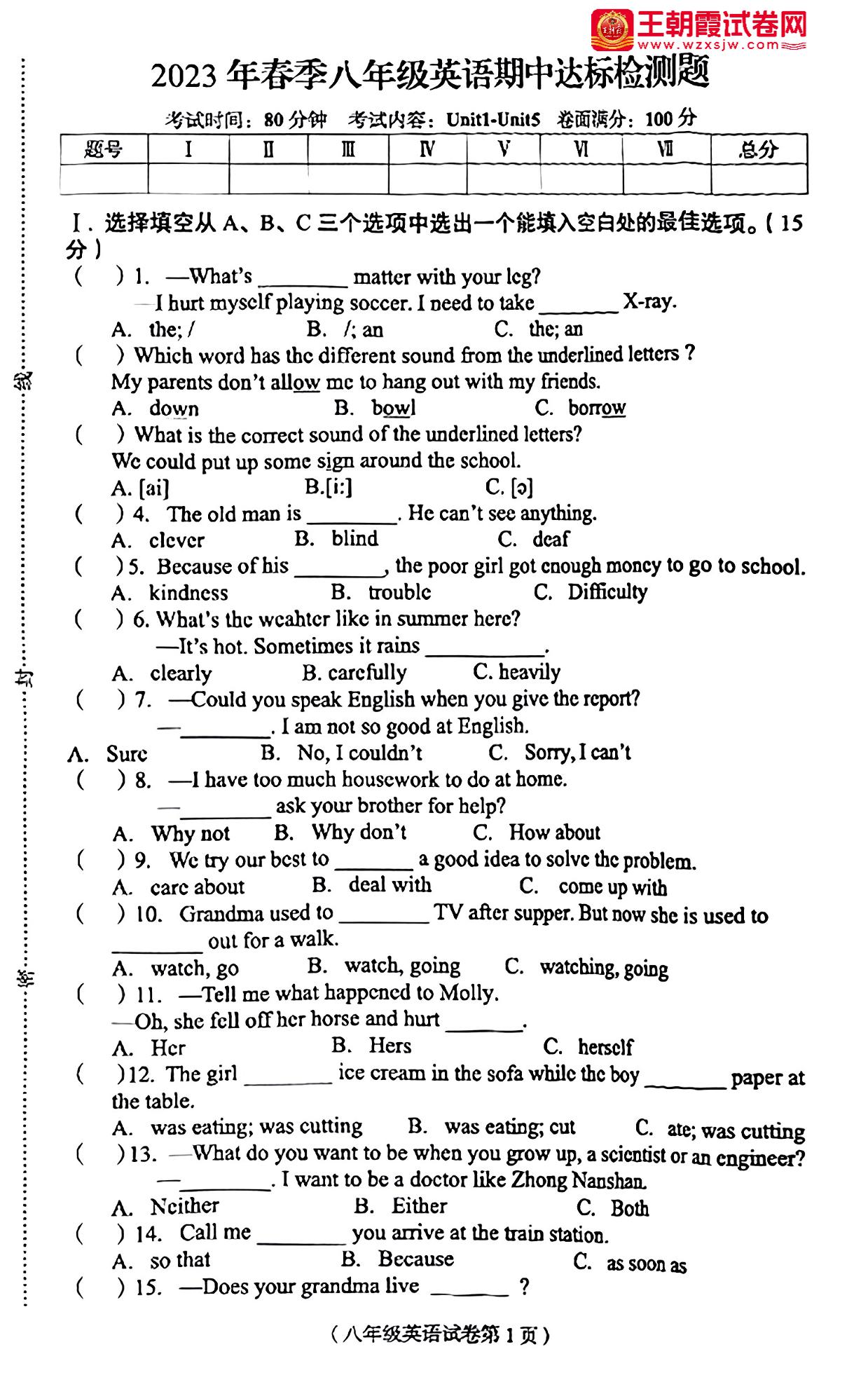八年级英语人教版下册期中卷